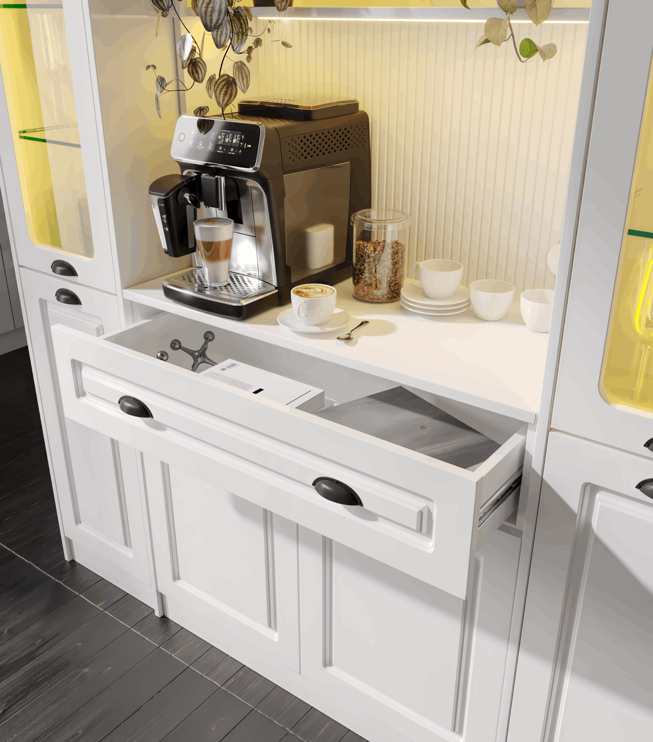 Orta bölümde yer alan kemer formuna sahip üst modül ve açık niş tasarımı, kahve makinesi ve günlük kullanım ürünleri için konforlu bir hazırlık alanı oluşturur. Alt modülde bulunan kapaklı dolap alanı; fincan, kahve ekipmanları ve aksesuarlar için düzenli ve gizli saklama imkânı sunar.
