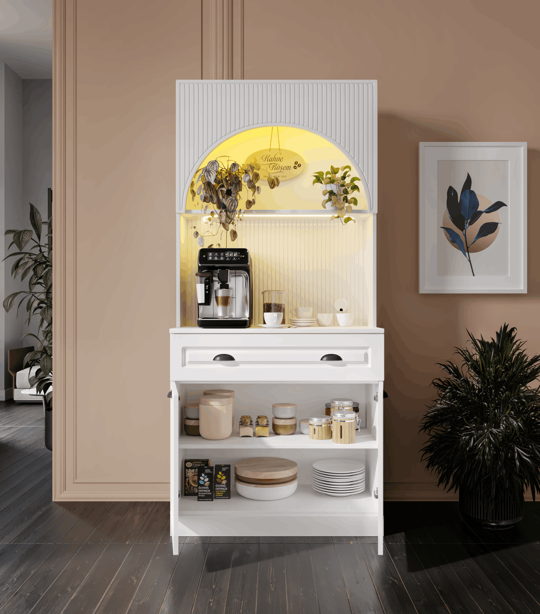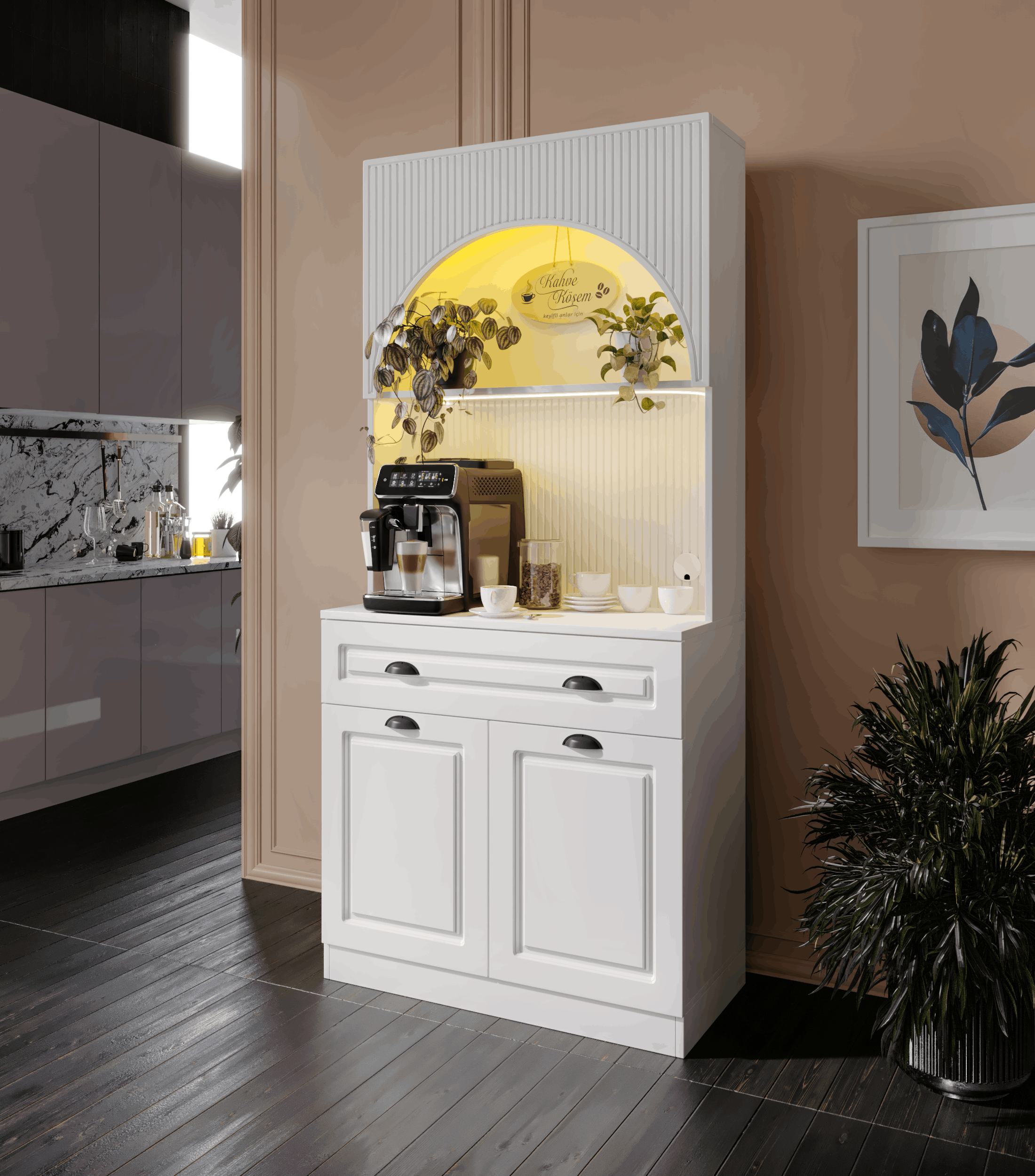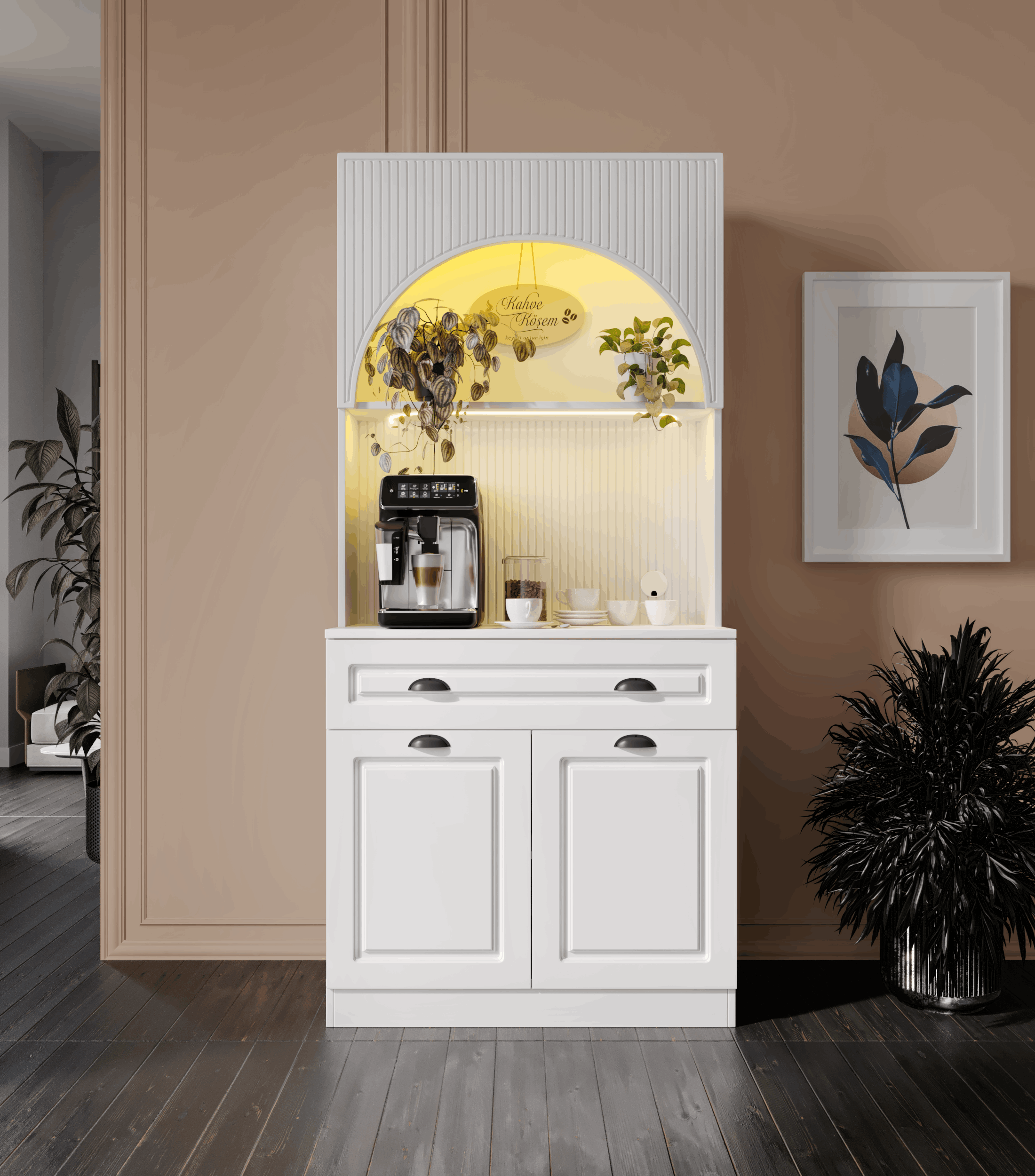 Kemer formuna sahip üst modül ve açık niş tasarımı, kahve makinesi ve günlük kullanım ürünleri için konforlu bir hazırlık alanı sunar. Alt modülde yer alan kapaklı dolap alanı ise fincan, kahve ekipmanları ve aksesuarlar için düzenli bir saklama imkânı sağlar.