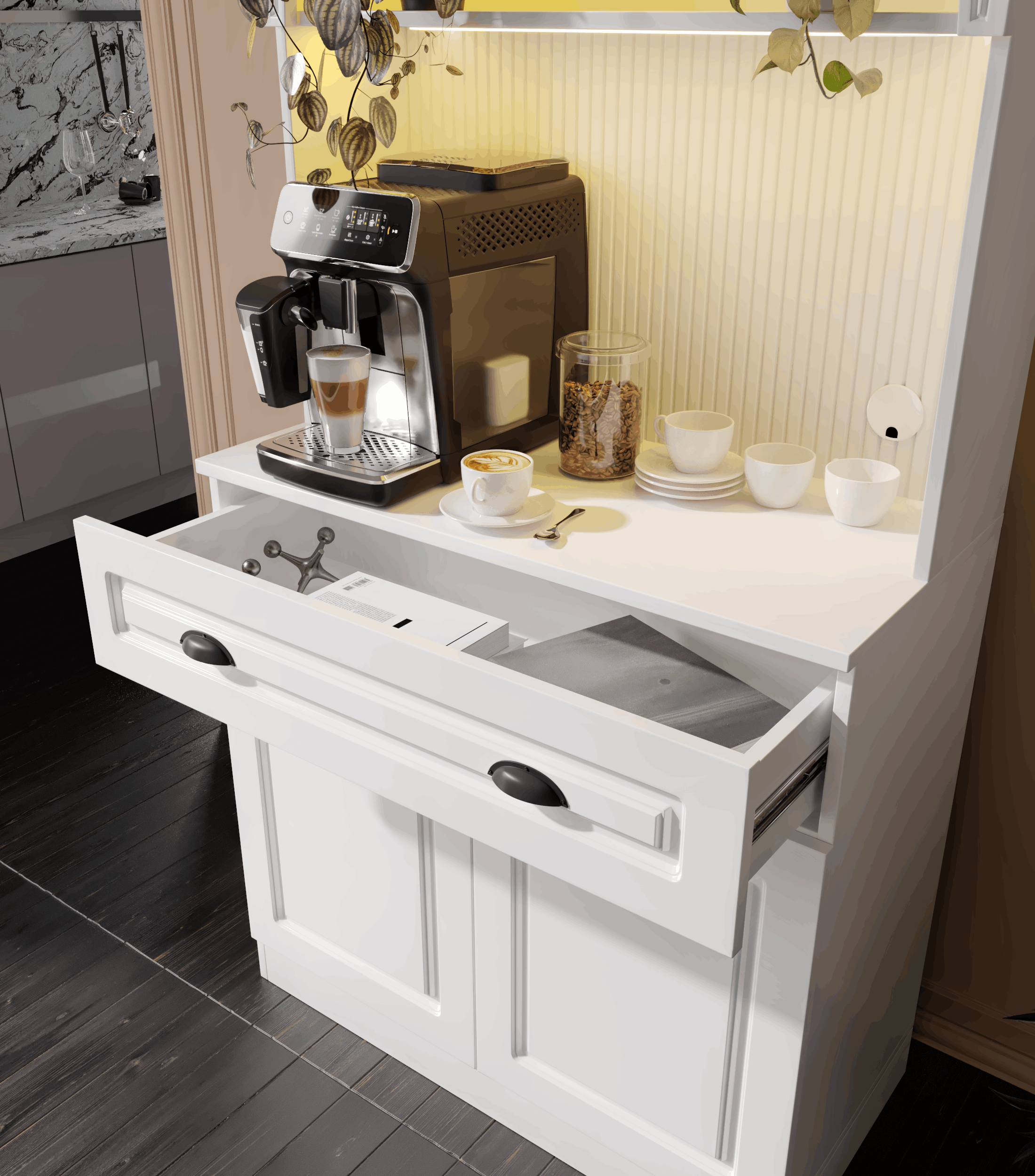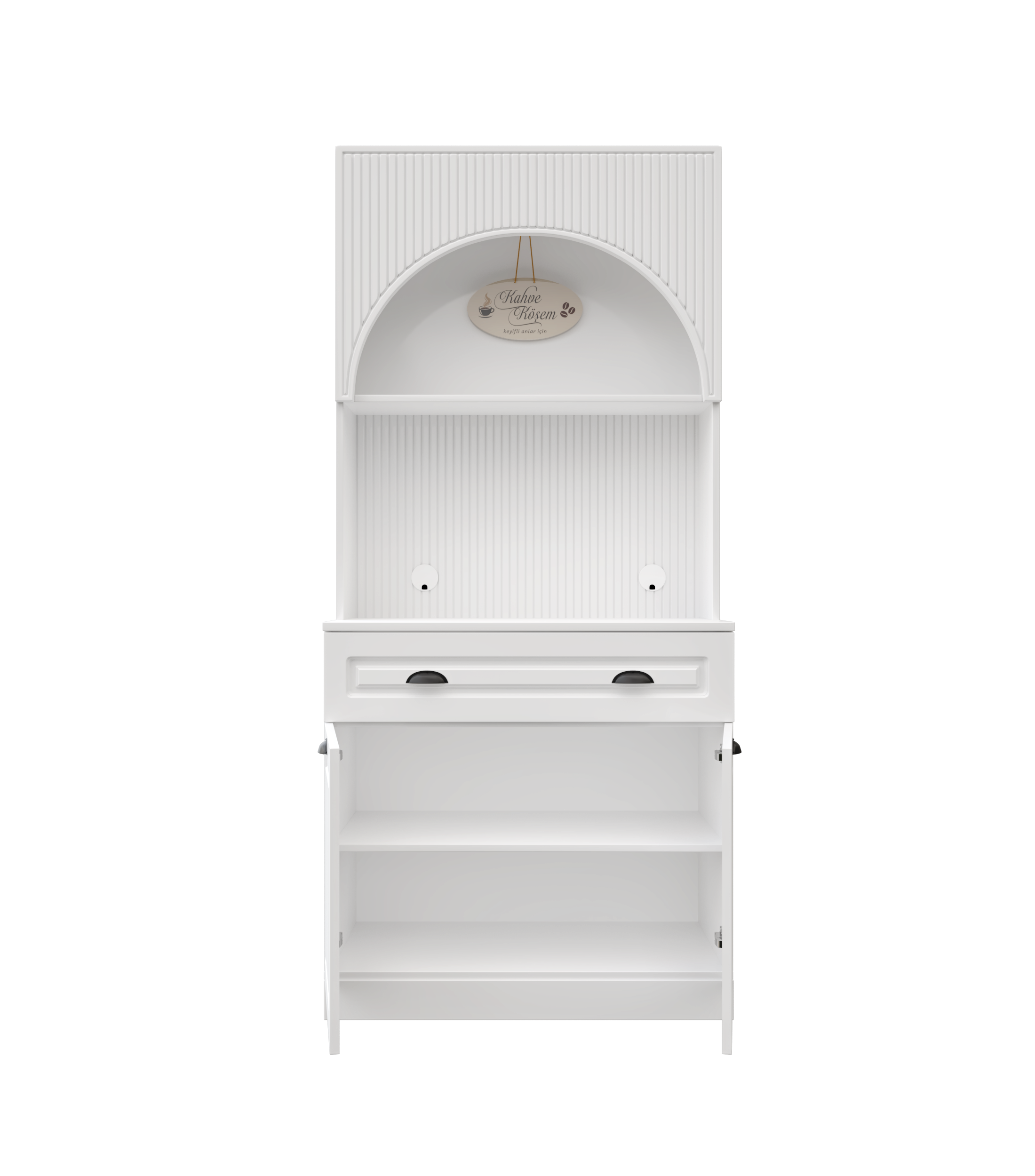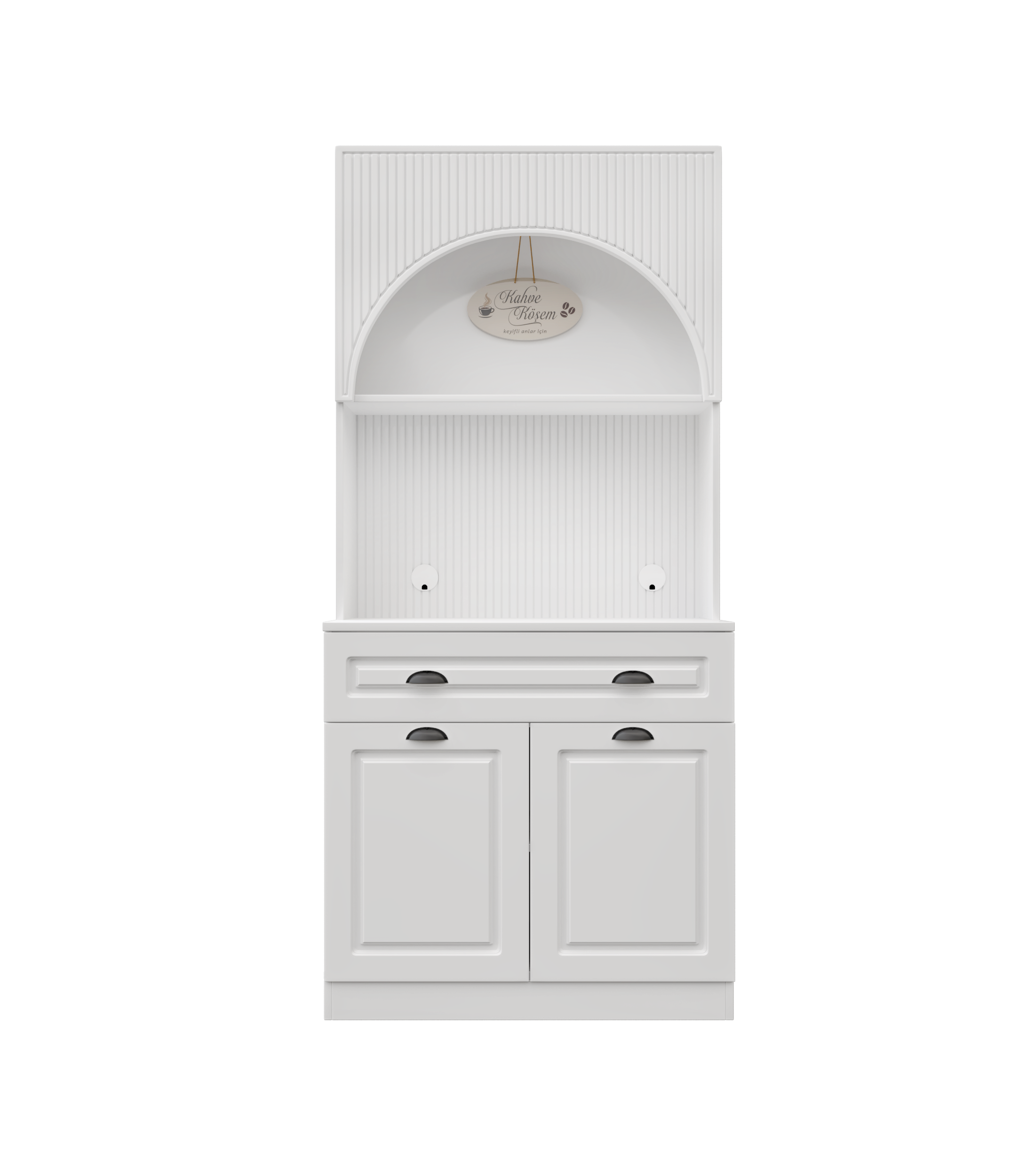 Kemer formuna sahip üst modül ve açık niş tasarımı, kahve makinesi ve günlük kullanım ürünleri için konforlu bir hazırlık alanı sunar. Alt modülde yer alan kapaklı dolap alanı ise fincan, kahve ekipmanları ve aksesuarlar için düzenli bir saklama imkânı sağlar.