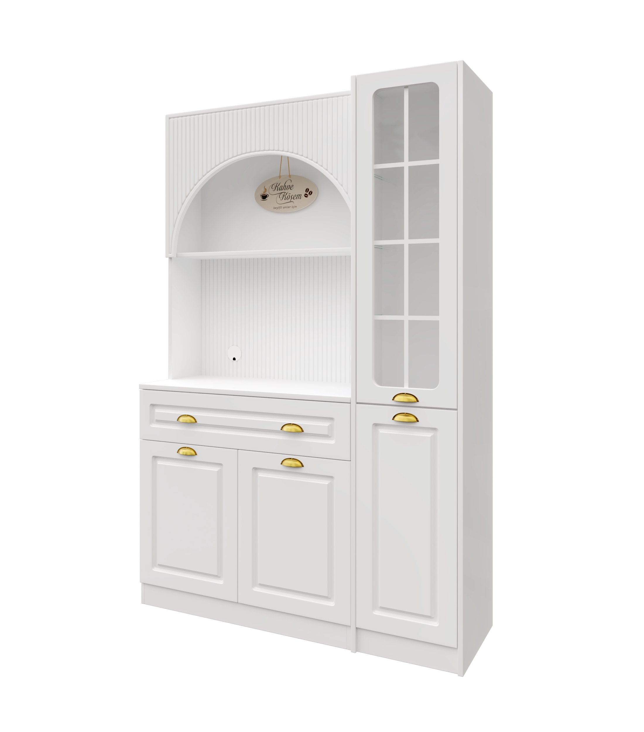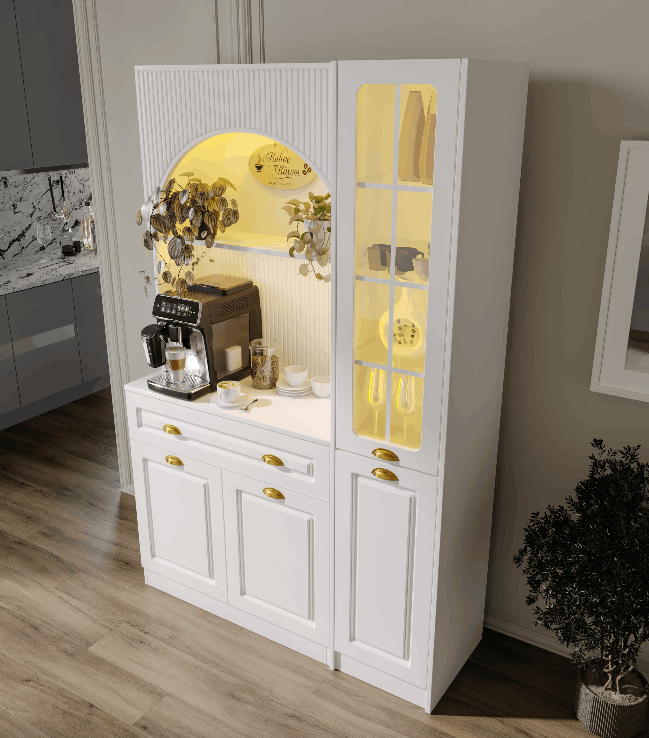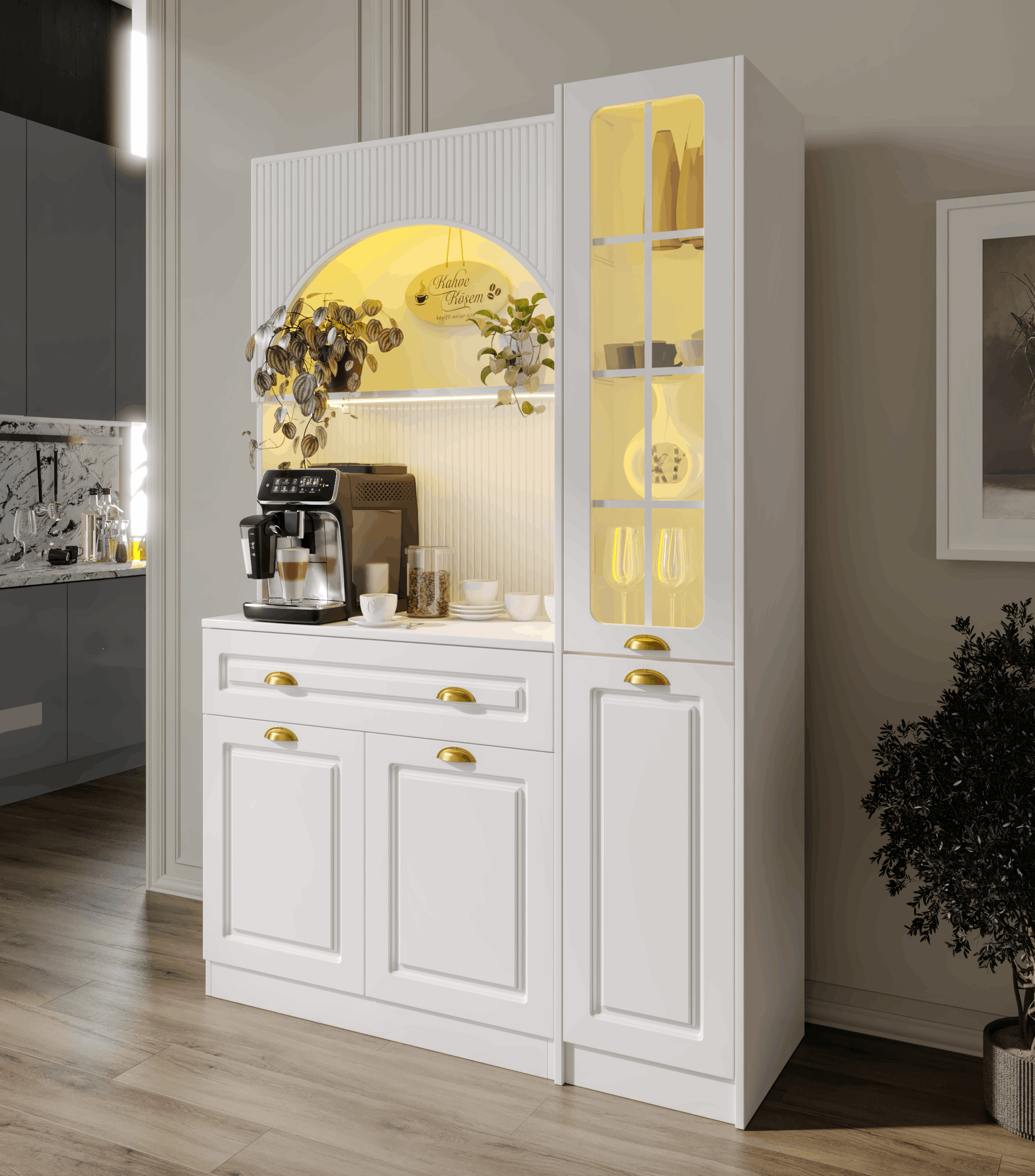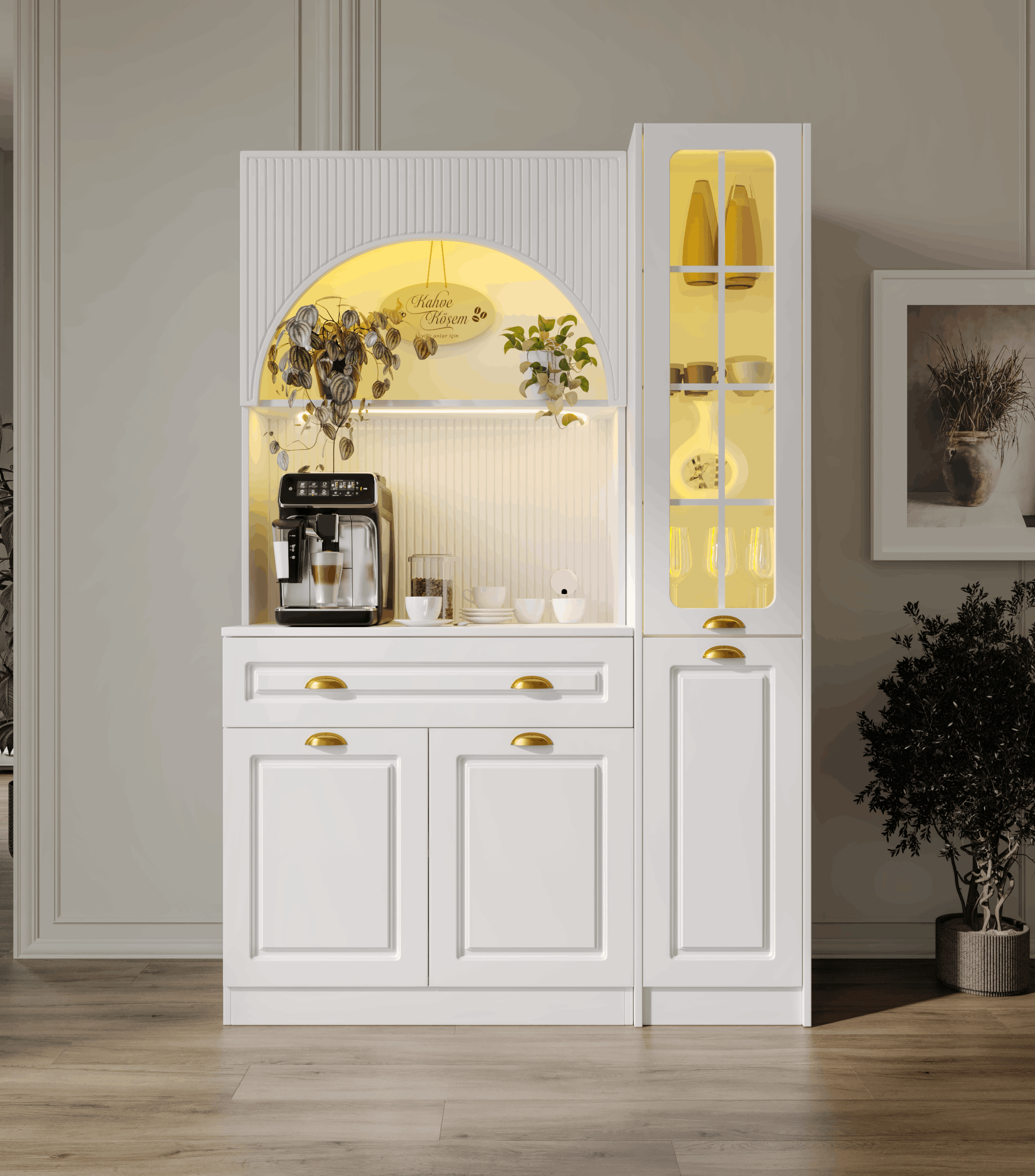 Kemer formuna sahip üst modül ve entegre aydınlatmalı açık niş alanı, kahve makinesi ve günlük kullanım ürünleri için konforlu bir hazırlık alanı oluşturur. Alt modülde yer alan kapaklı dolap bölümü ise fincan, kahve ekipmanları ve aksesuarlar için düzenli saklama imkânı sağlar.