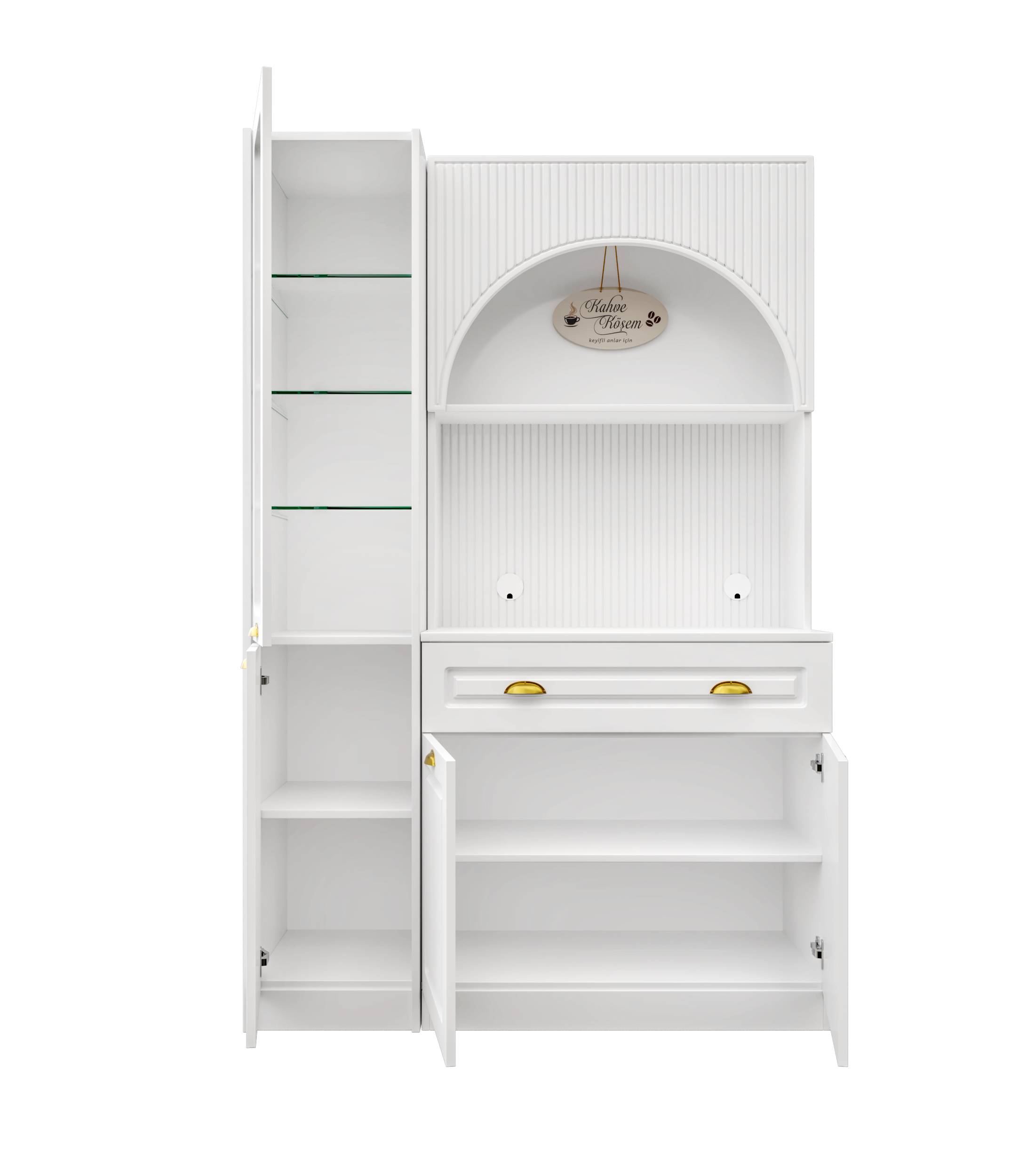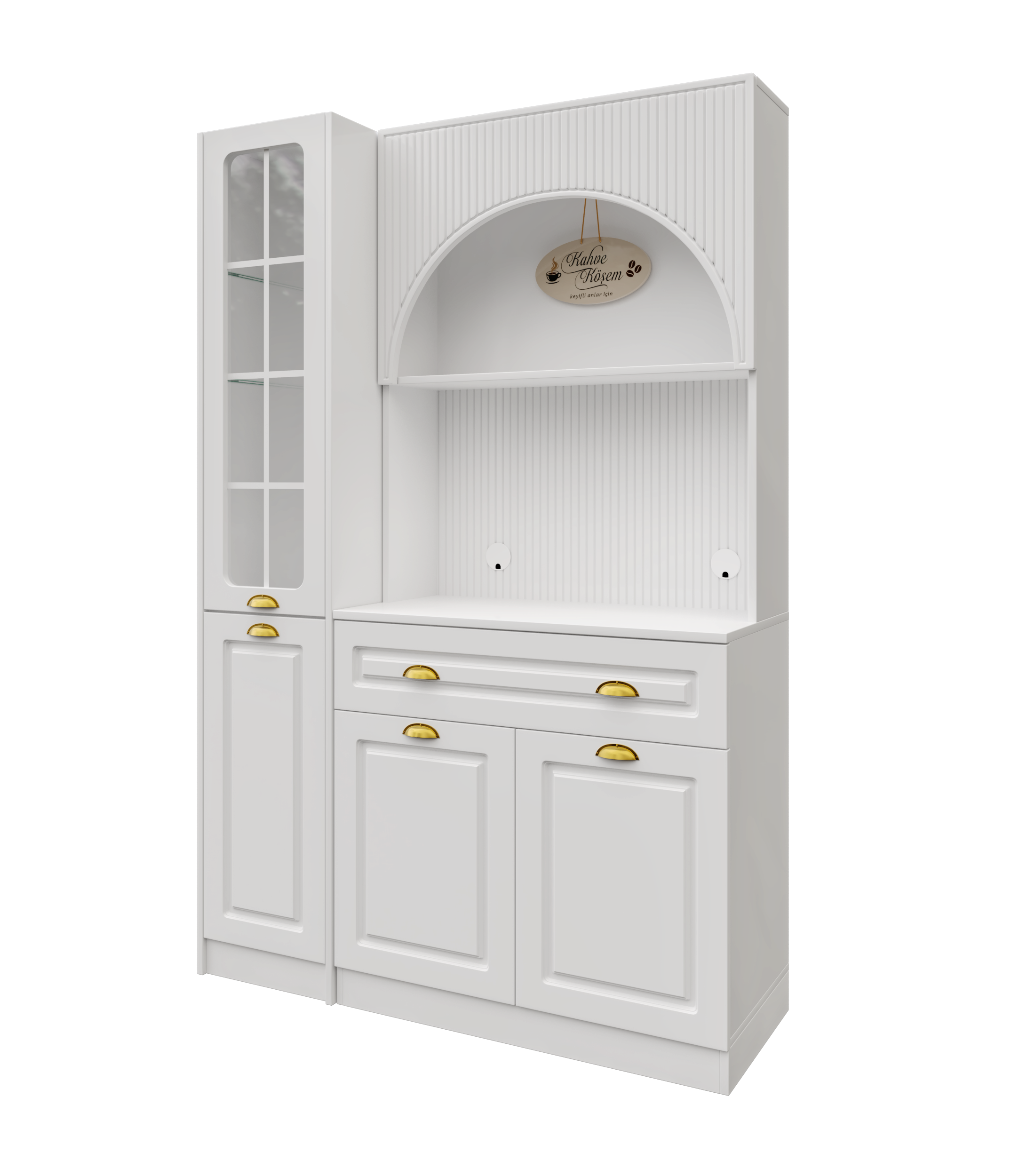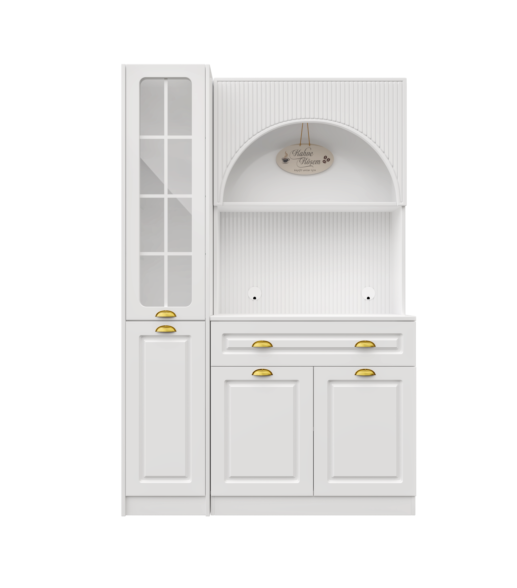 Kemer formuna sahip üst modül ve açık niş tasarımı, kahve makinesi ve günlük kullanım ürünleri için konforlu bir hazırlık alanı oluşturur. Alt modülde yer alan kapaklı dolap alanı; fincan, kahve ekipmanları ve aksesuarlar için düzenli bir saklama imkânı sağlar.