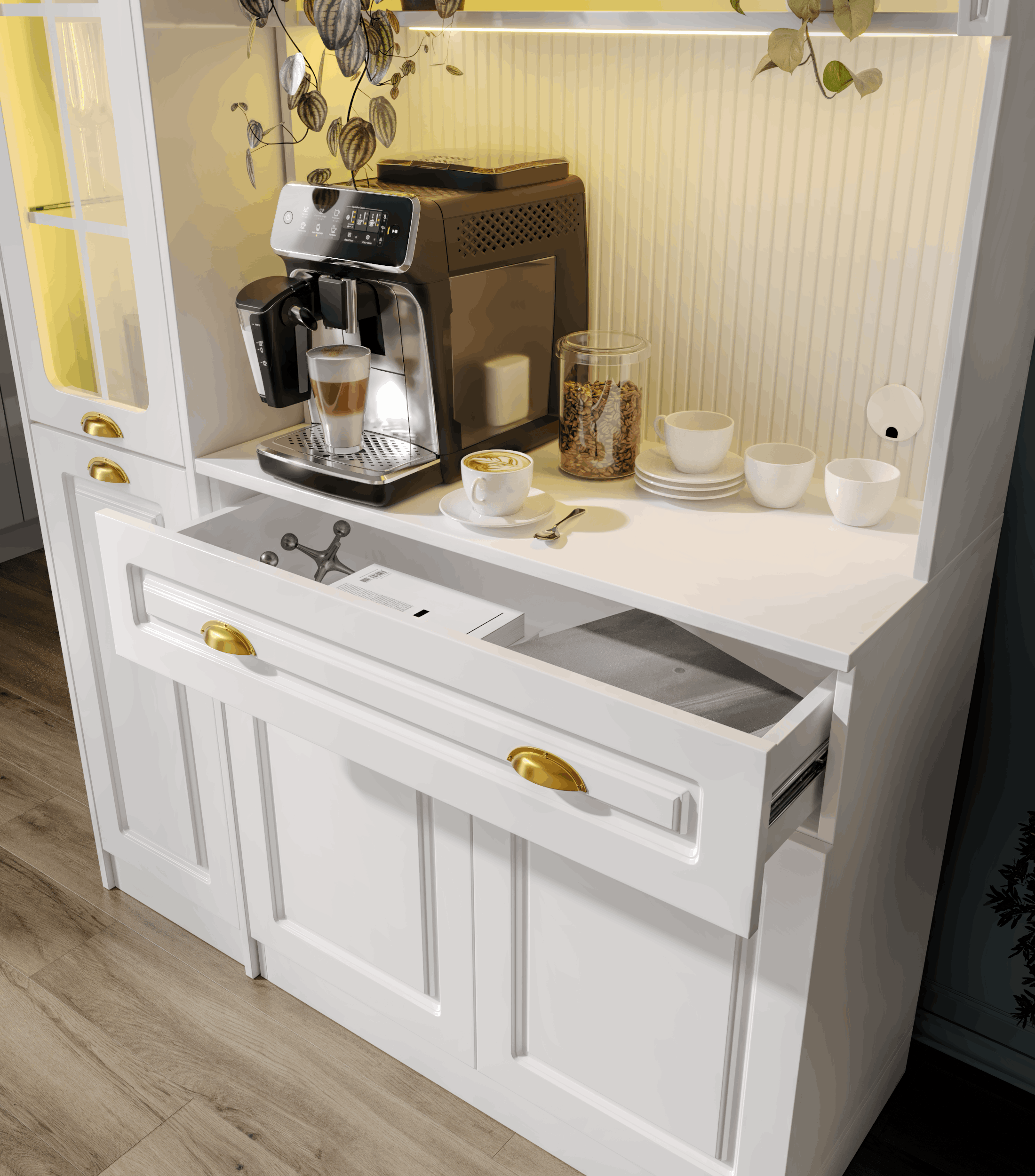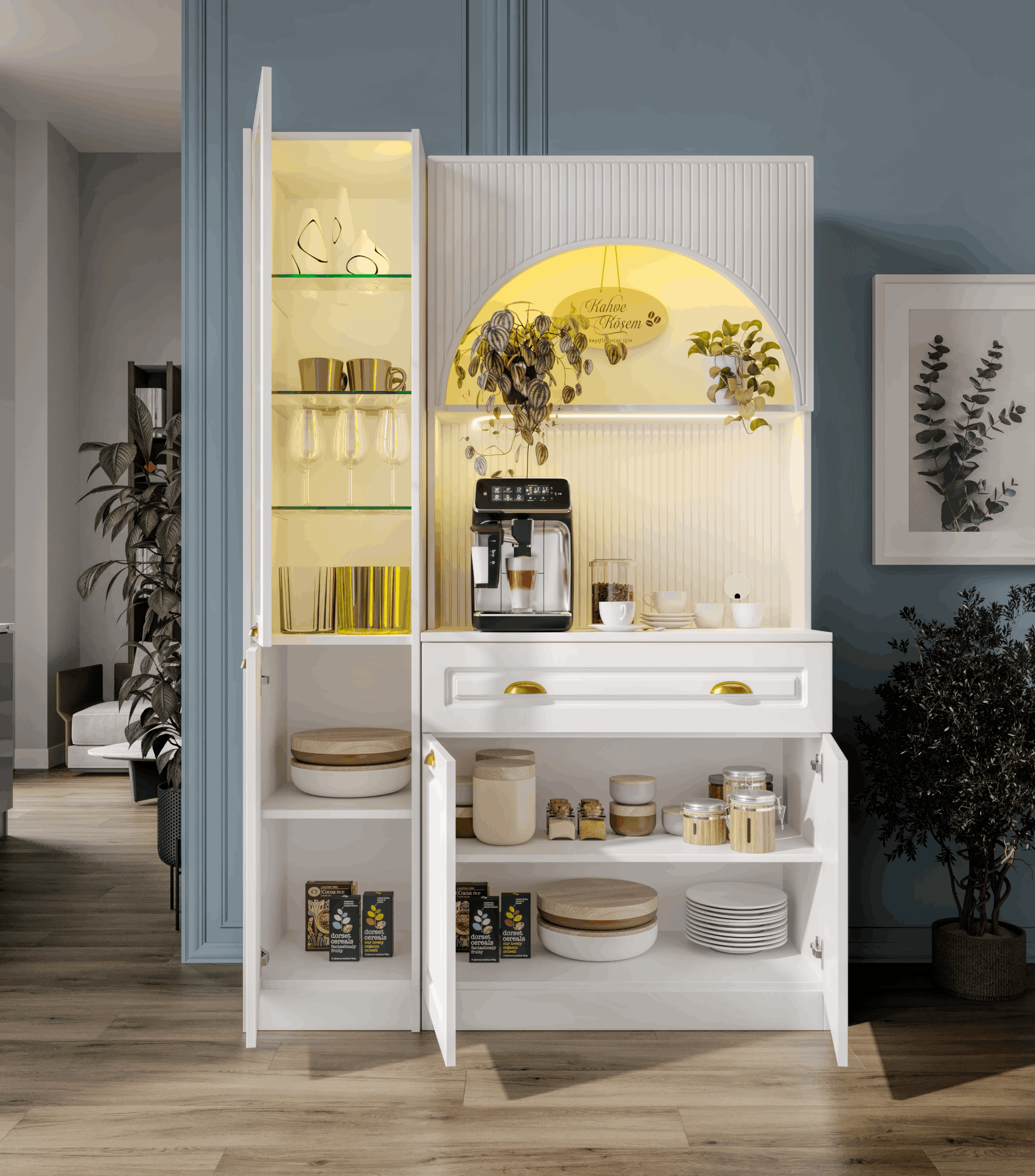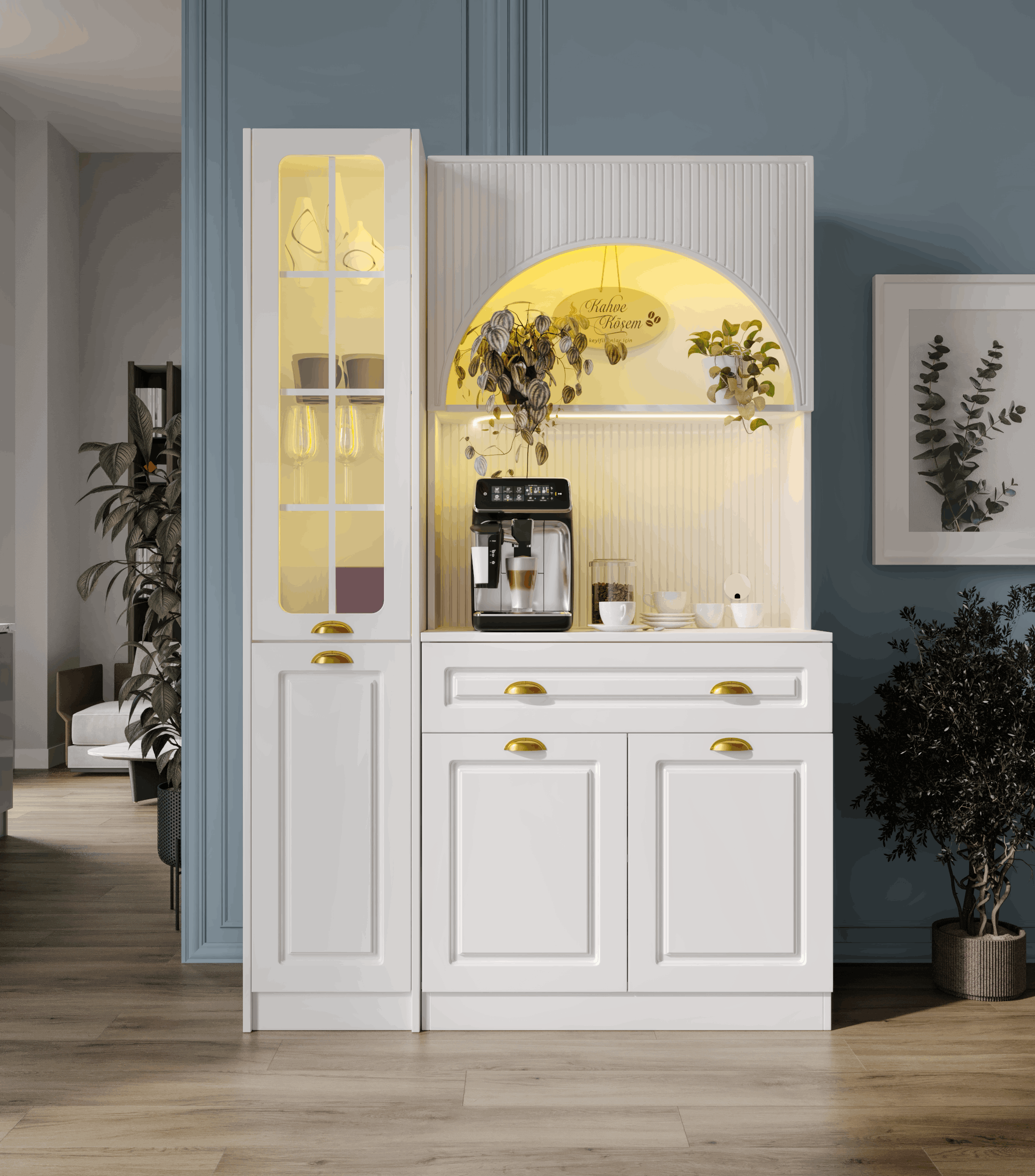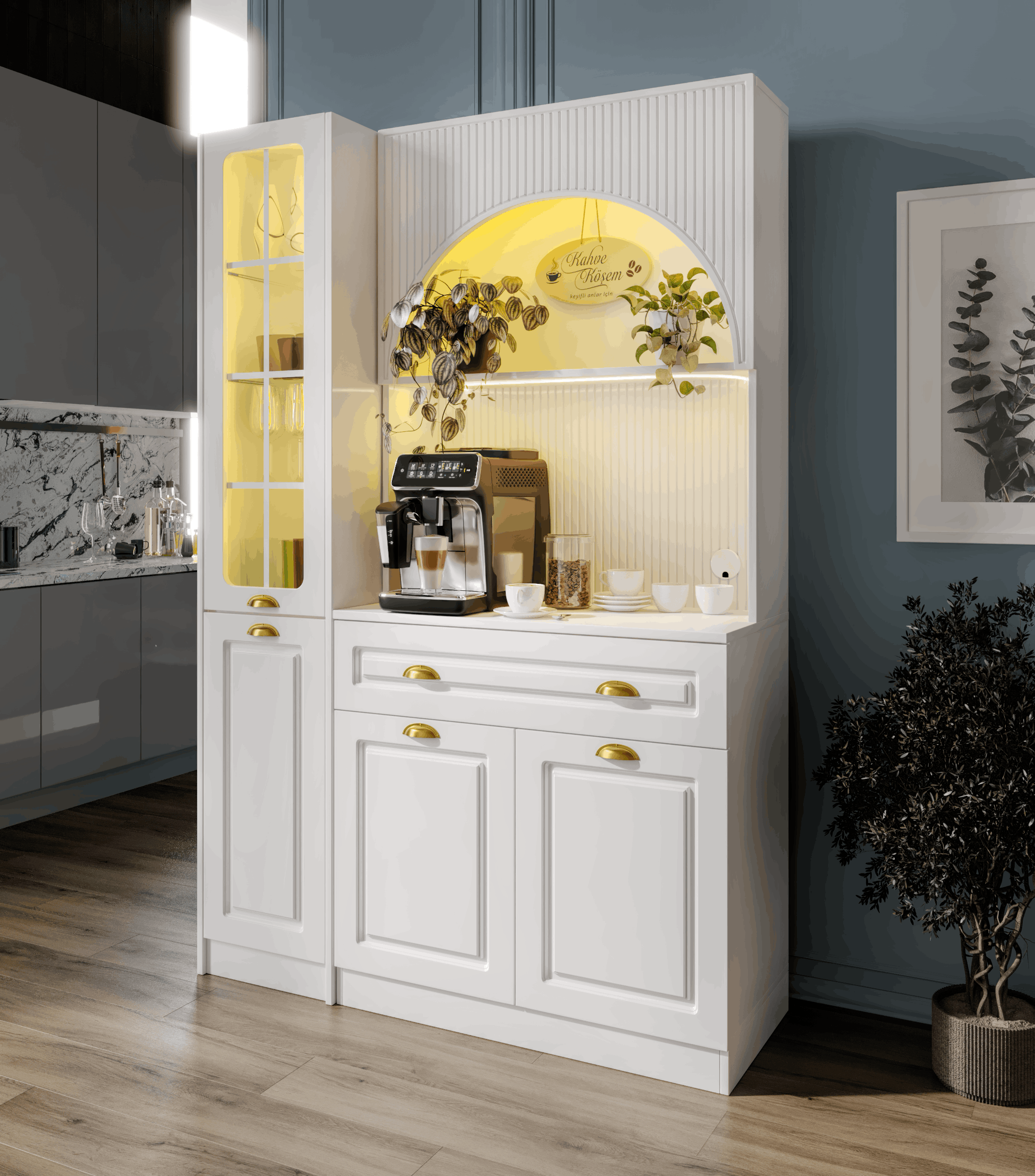 Kemer formuna sahip üst modül ve açık niş tasarımı, kahve makinesi ve günlük kullanım ürünleri için konforlu bir hazırlık alanı oluşturur. Alt modülde yer alan kapaklı dolap alanı; fincan, kahve ekipmanları ve aksesuarlar için düzenli bir saklama imkânı sağlar.