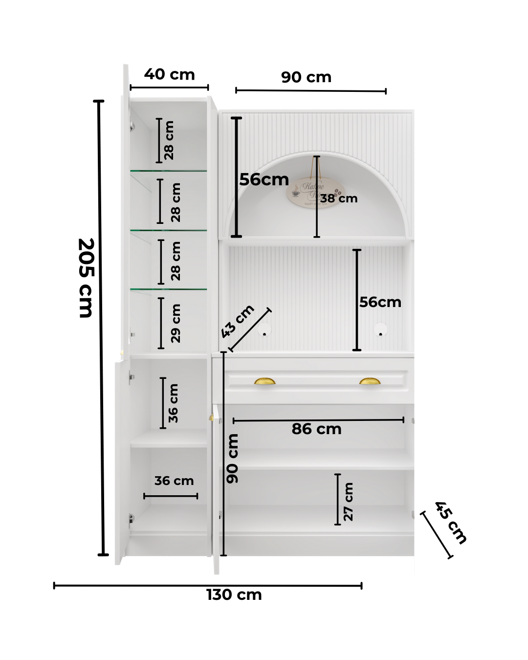 - Sol Vitrin: Genişlik 40 cm / Yükseklik 205 cm / Derinlik 45 cm