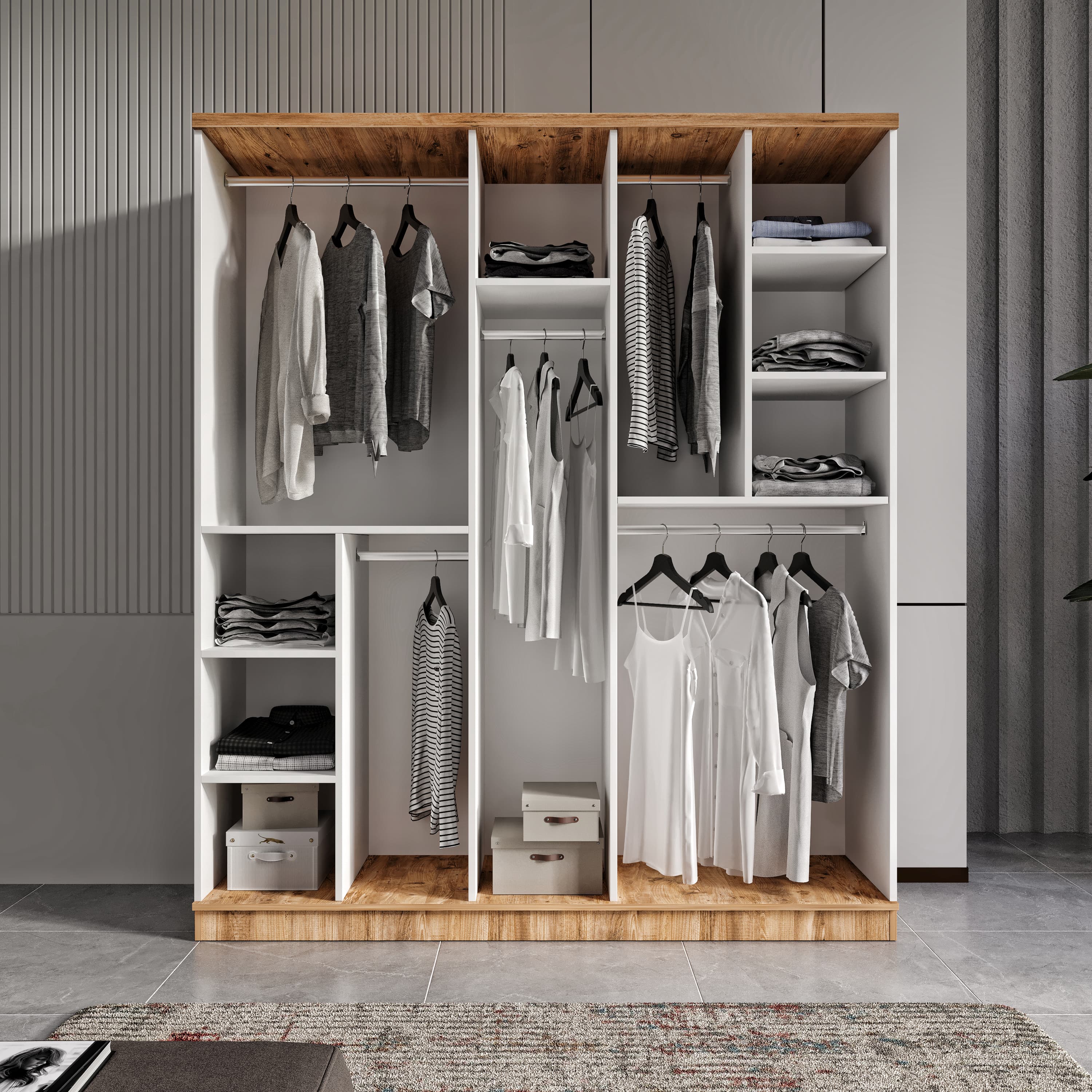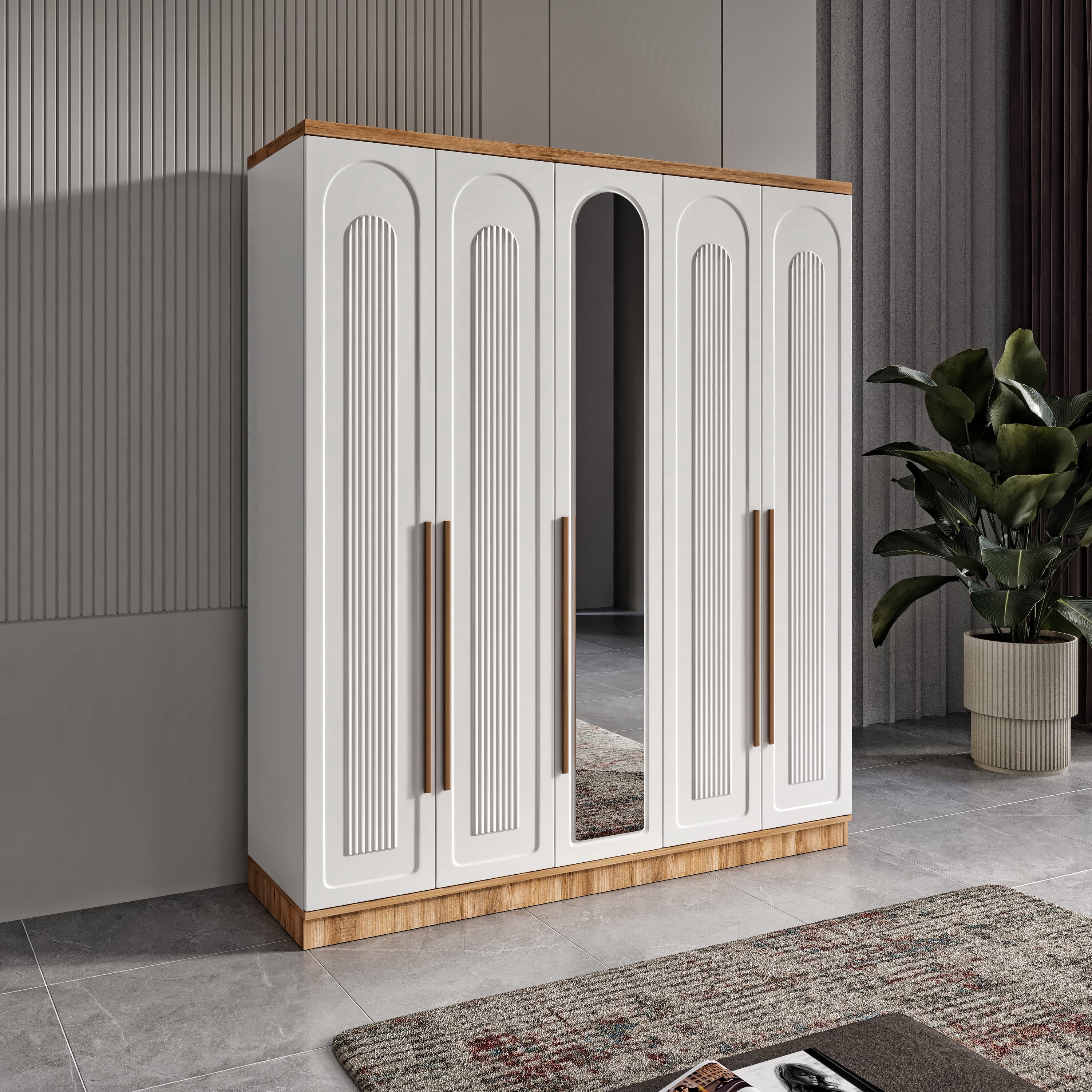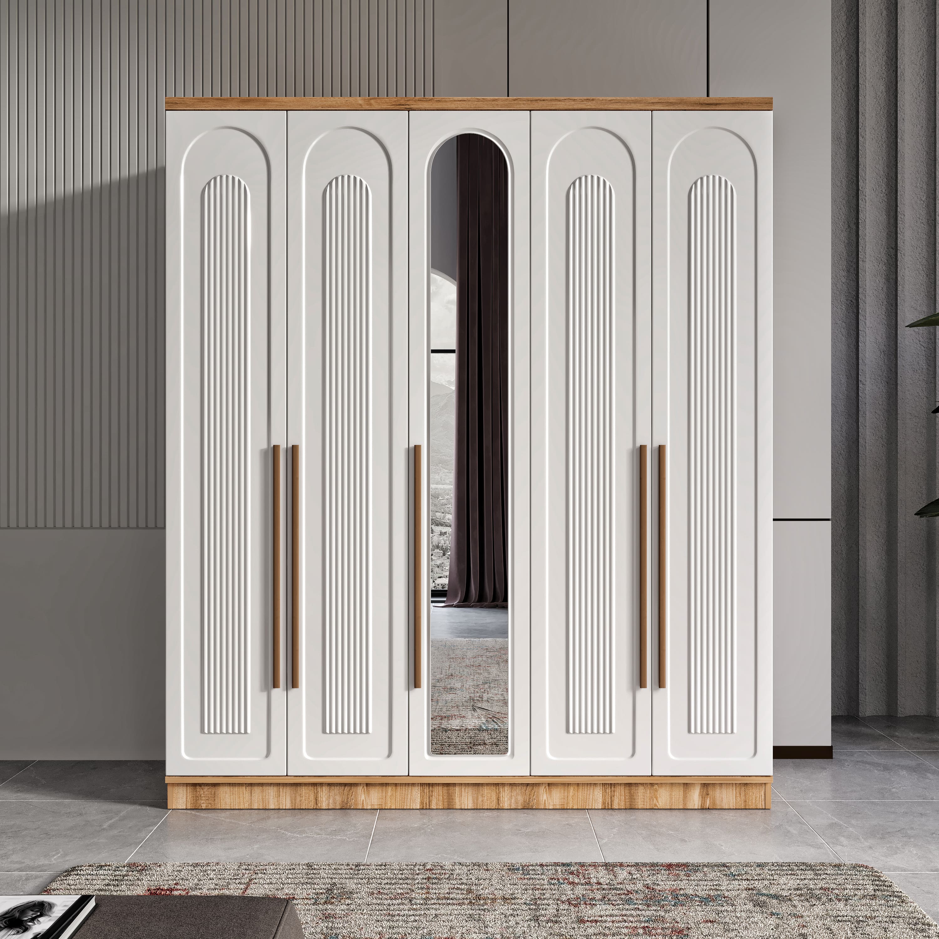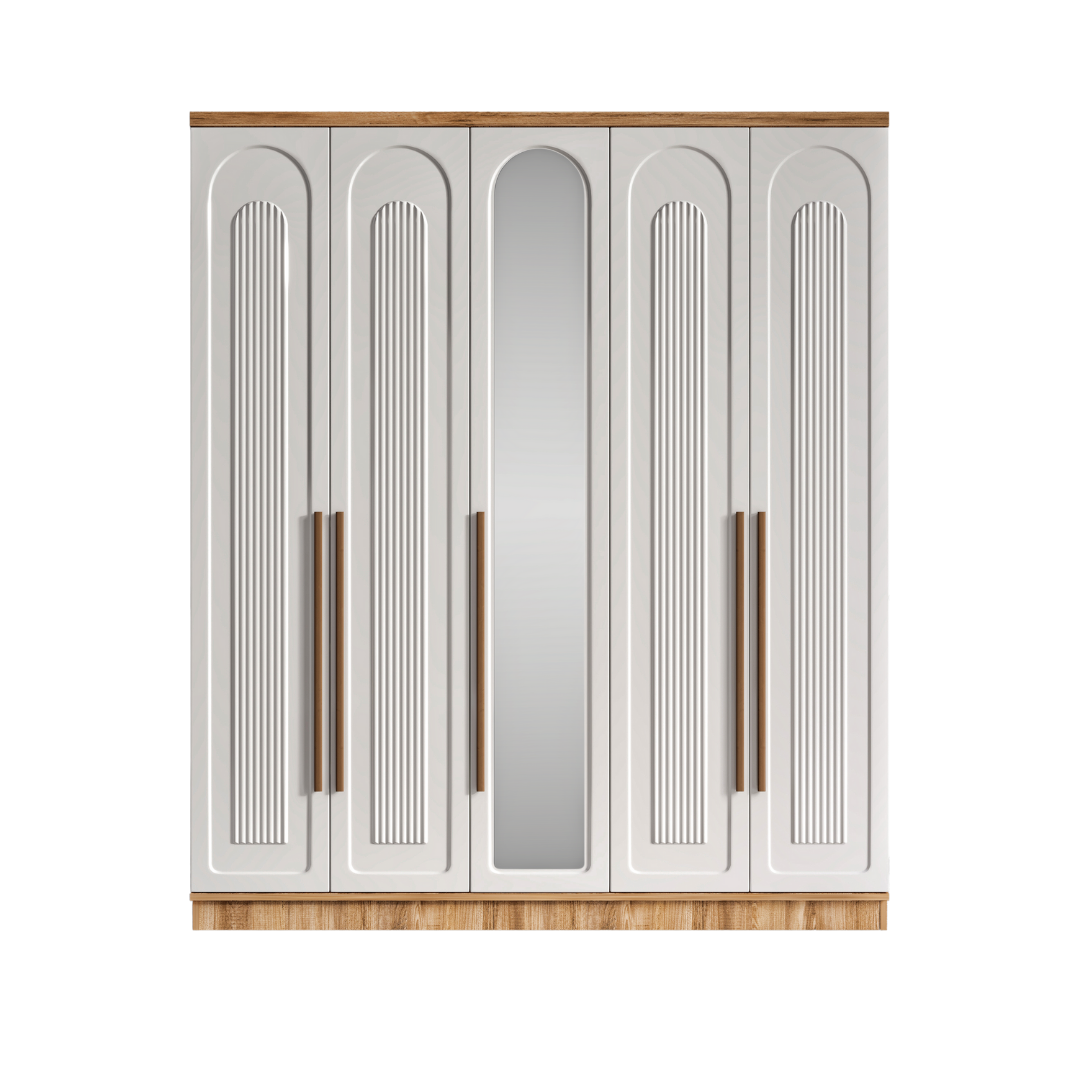Seronay Floren 5 Kapaklı Aynalı Gardırop, yaşam alanında düzen ve estetiği bir araya getiren fonksiyonel bir gardırop modelidir. Depolama ihtiyacına pratik bir çözüm sunarken modern tasarım dili sayesinde yatak odasına dengeli ve şık bir görünüm kazandırır.