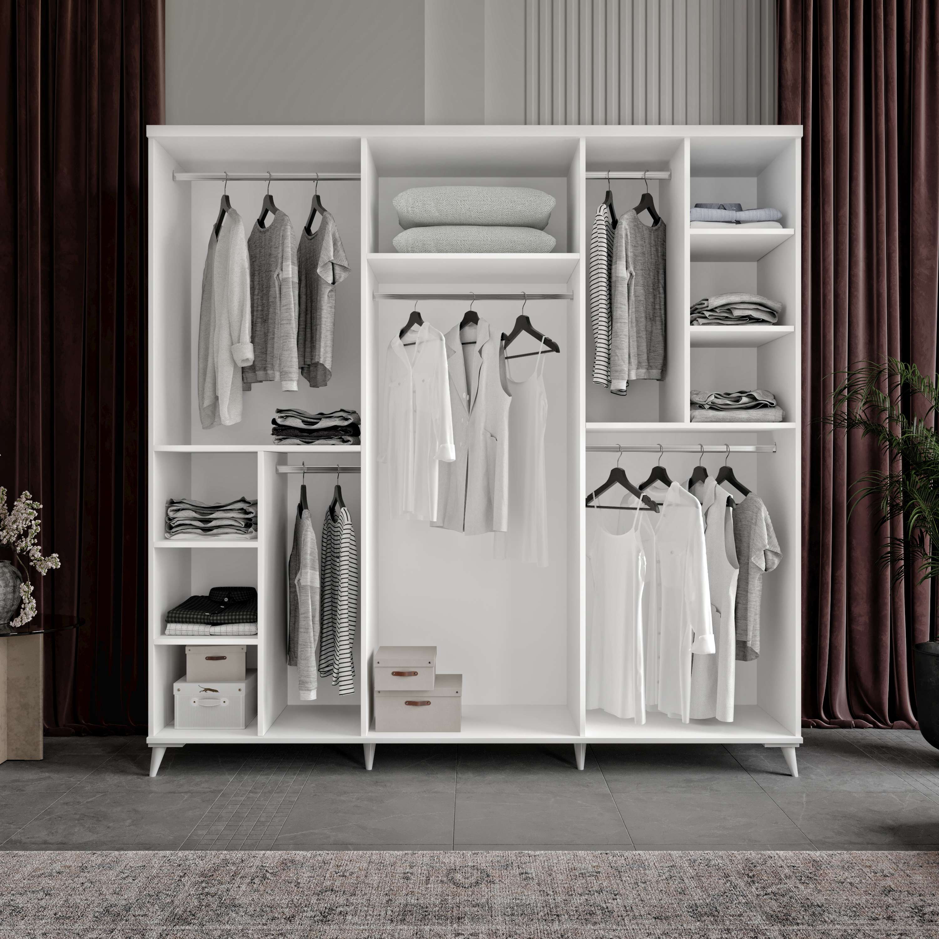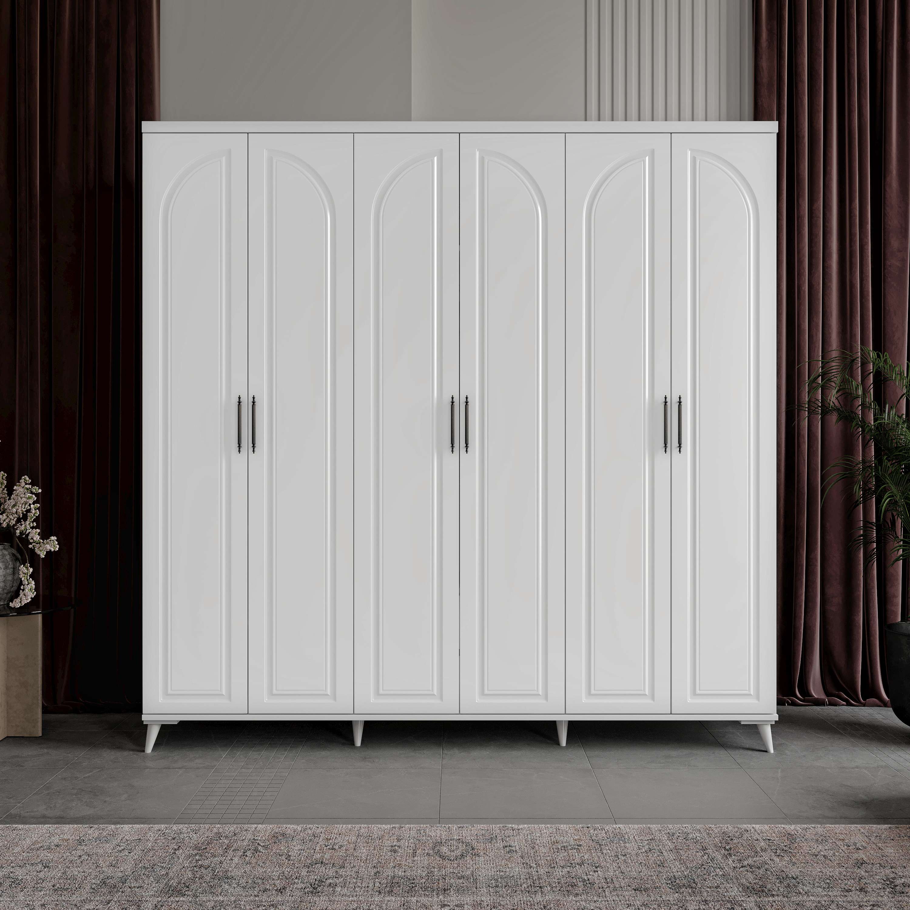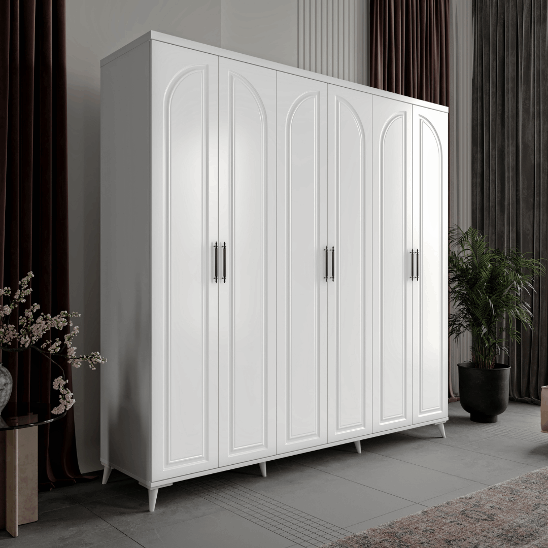 Seronay Kerem 6 Kapaklı Beyaz Gardırop, yaşam alanında düzen ve estetiği bir araya getiren fonksiyonel bir gardırop modelidir. Depolama ihtiyacına pratik bir çözüm sunarken modern tasarım dili sayesinde yatak odasına dengeli ve şık bir görünüm kazandırır.