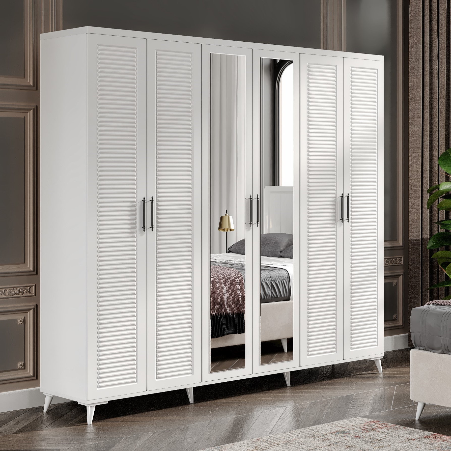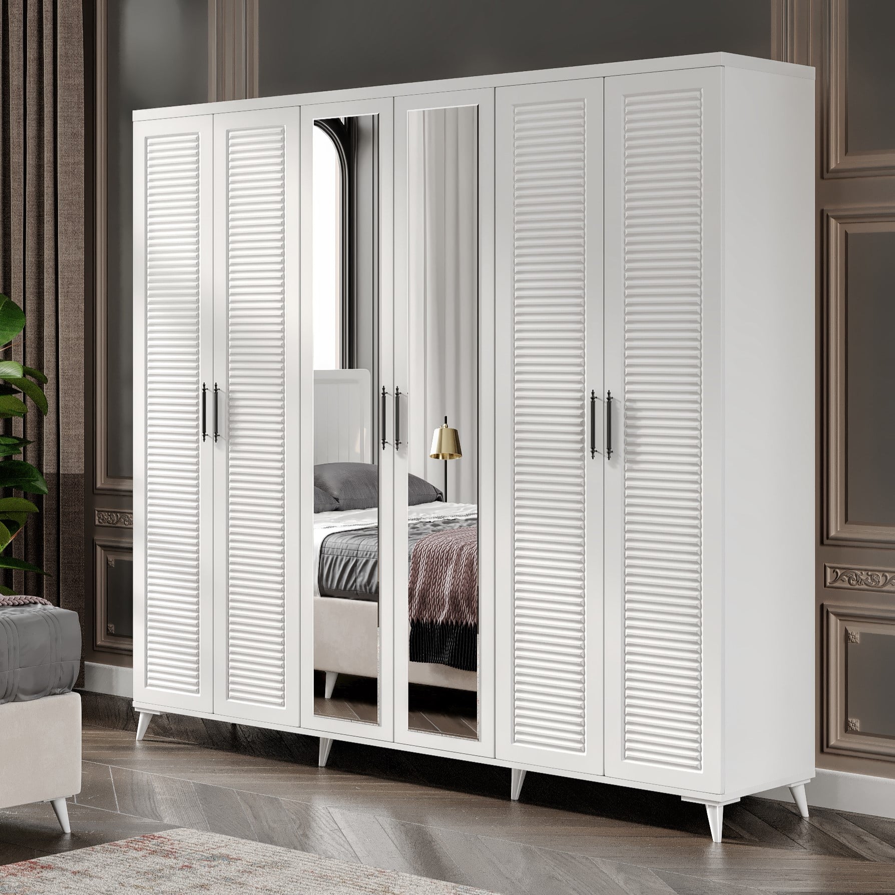 Seronay Lavin 6 Kapaklı Aynalı Beyaz Gardırop, yaşam alanında düzen ve estetiği bir araya getiren fonksiyonel bir gardırop modelidir. Depolama ihtiyacına pratik bir çözüm sunarken modern tasarım dili sayesinde yatak odasına dengeli ve şık bir görünüm kazandırır.
