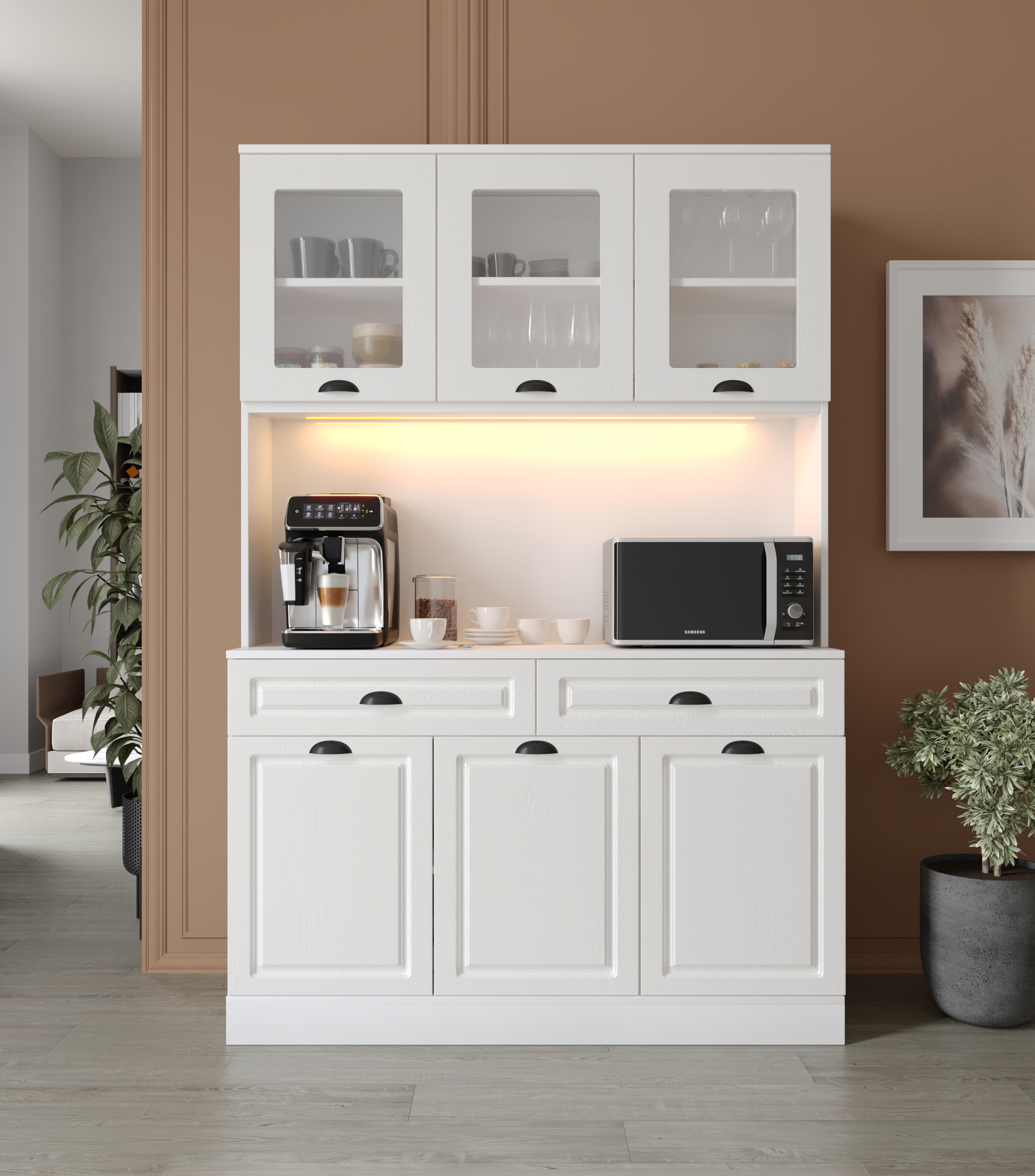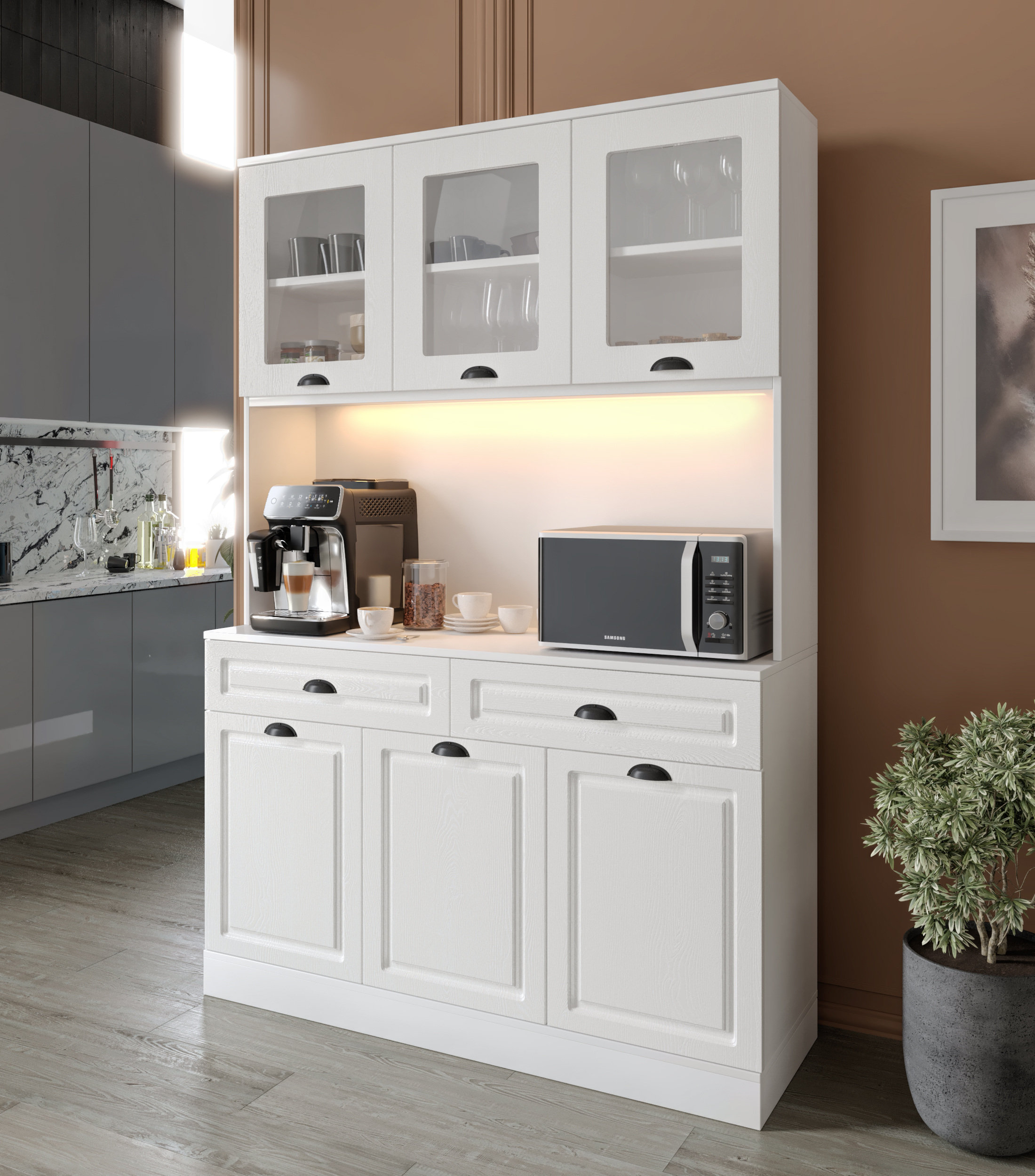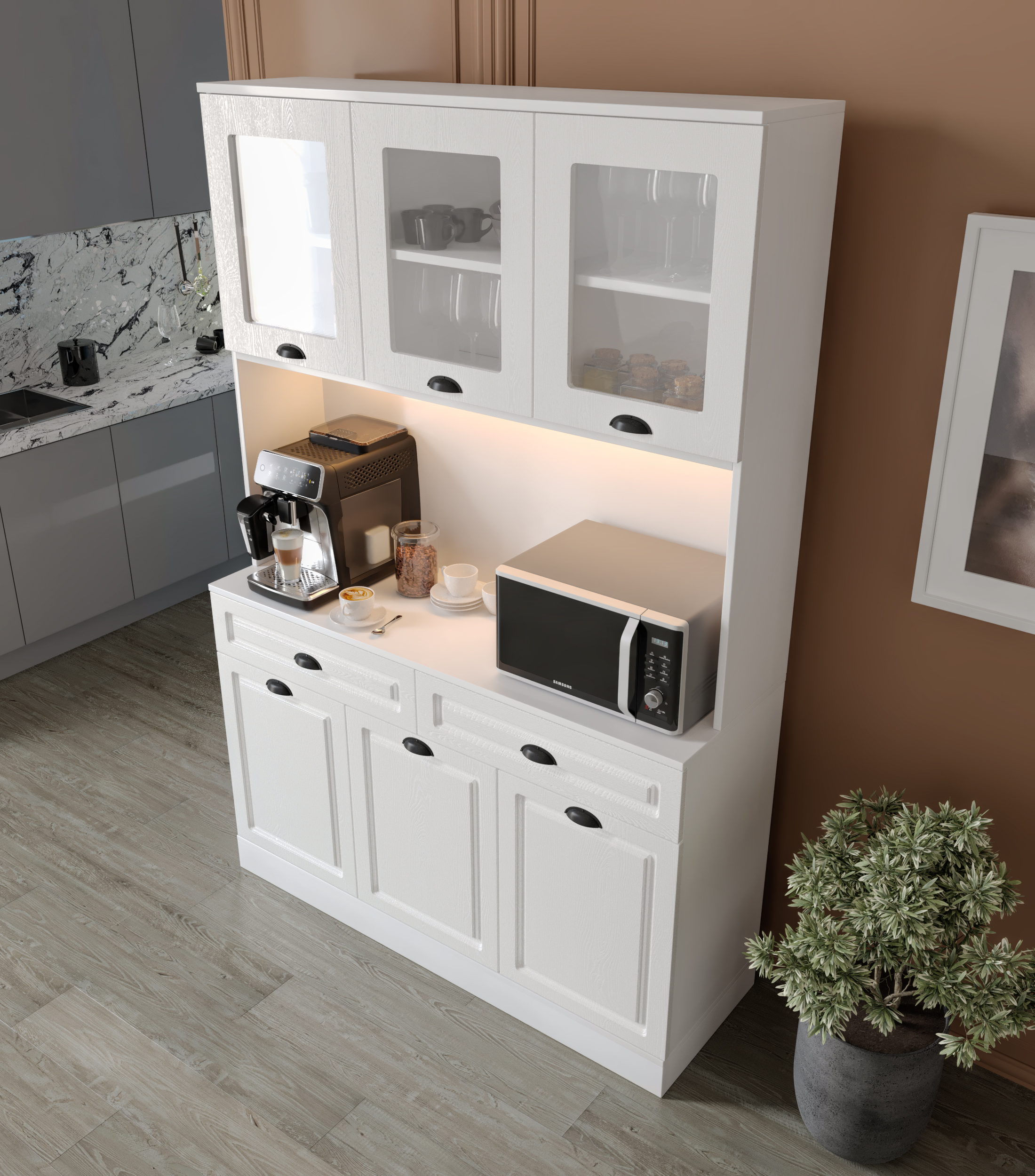 Seronay Lunera Kahve Köşesi - 140 cm MDF Mutfak Dolabı - LED Aydınlatmalı -, kahve hazırlık alanını düzenli ve şık hale getirmek isteyenler için tasarlanmış modern bir kahve köşesi çözümüdür. Günlük kullanıma uyum sağlayan depolama alanı ve sergileme yüzeyi sayesinde mutfak ya da yaşam alanına düzenli bir görünüm kazandırır.