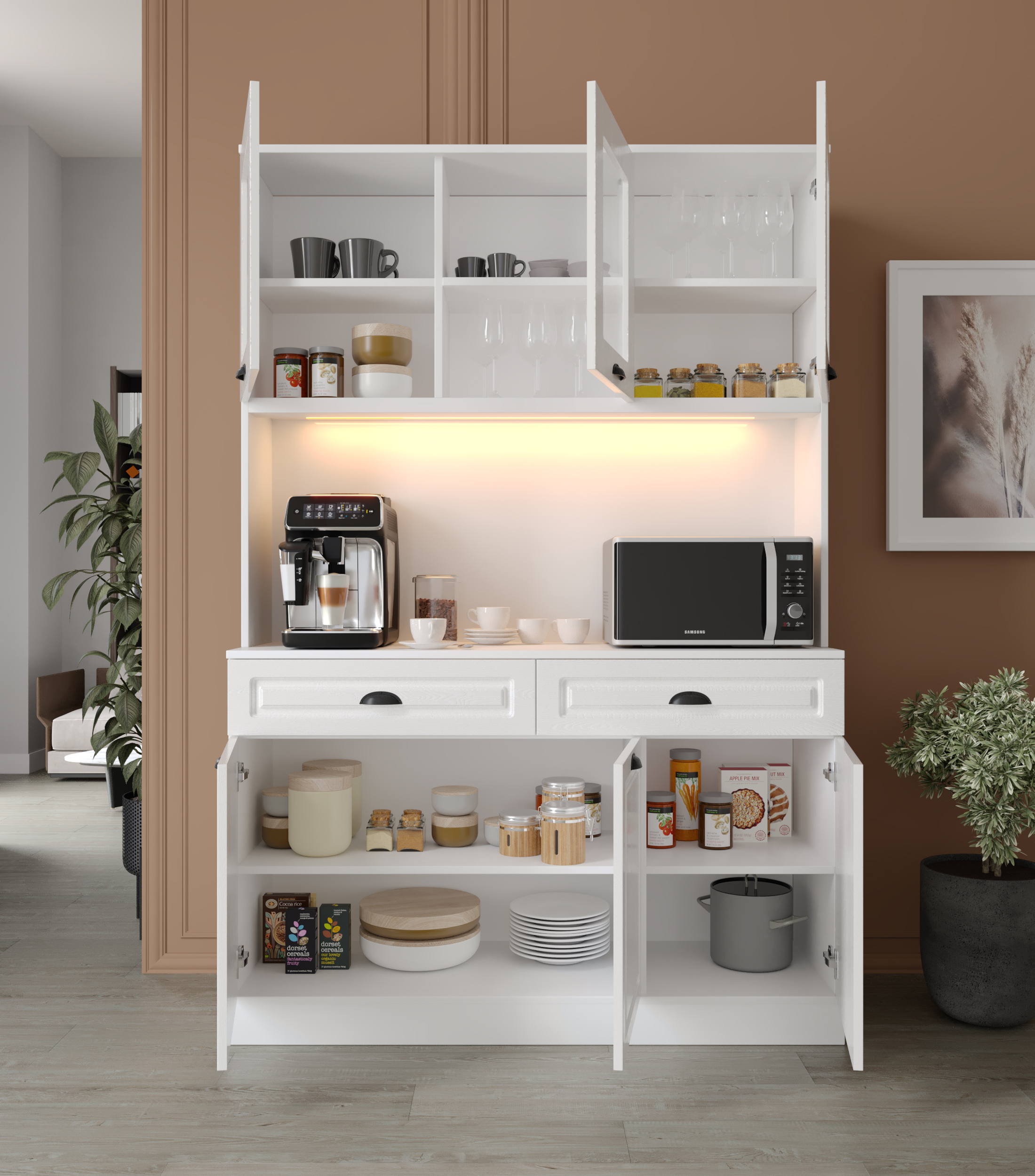 - Çok amaçlı kullanım: Kahve köşesi, airfryer dolabı, mutfak dolabı