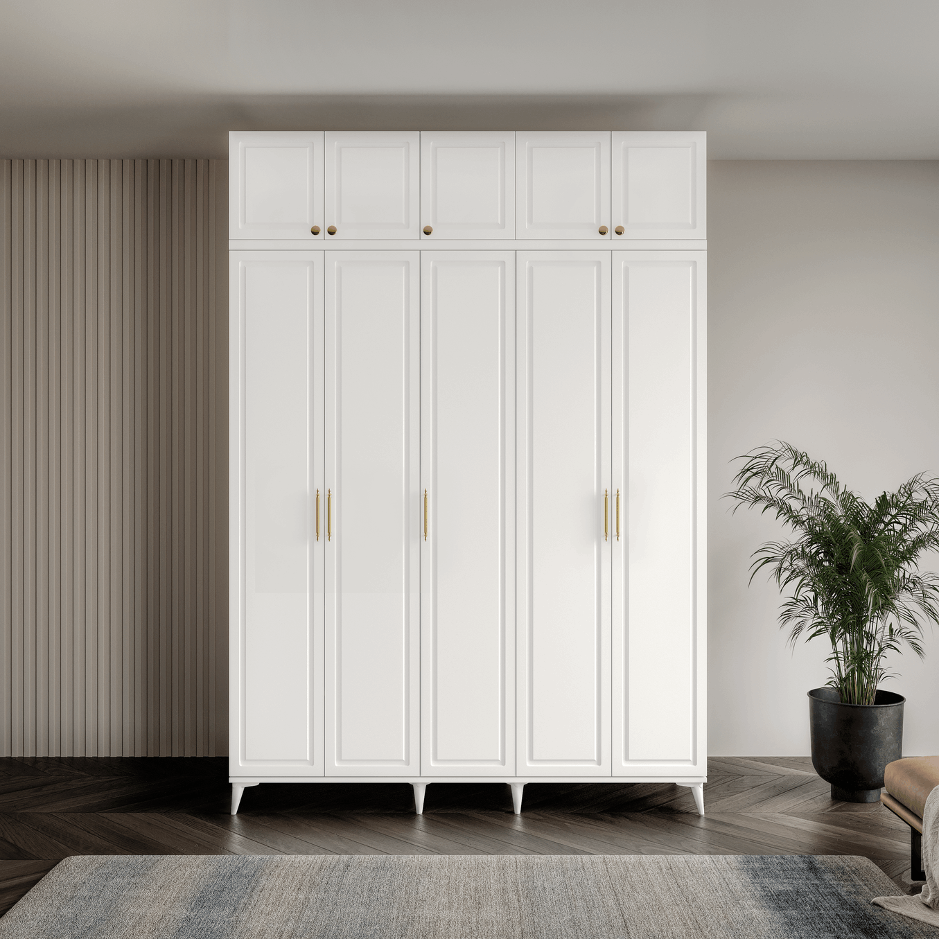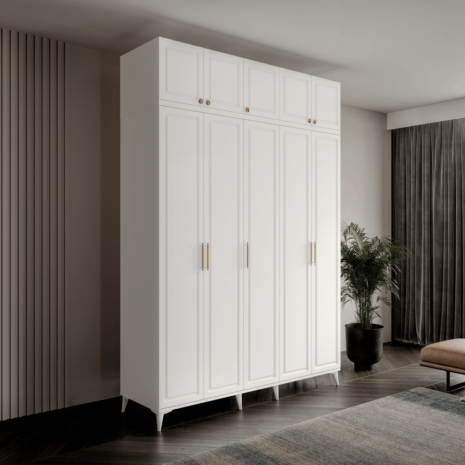 Seronay Milen Gold 5 Kapaklı Ayaklı Yüklüklü Gardırop, yaşam alanında düzen ve estetiği bir araya getiren fonksiyonel bir gardırop modelidir. Depolama ihtiyacına pratik bir çözüm sunarken modern tasarım dili sayesinde yatak odasına dengeli ve şık bir görünüm kazandırır.