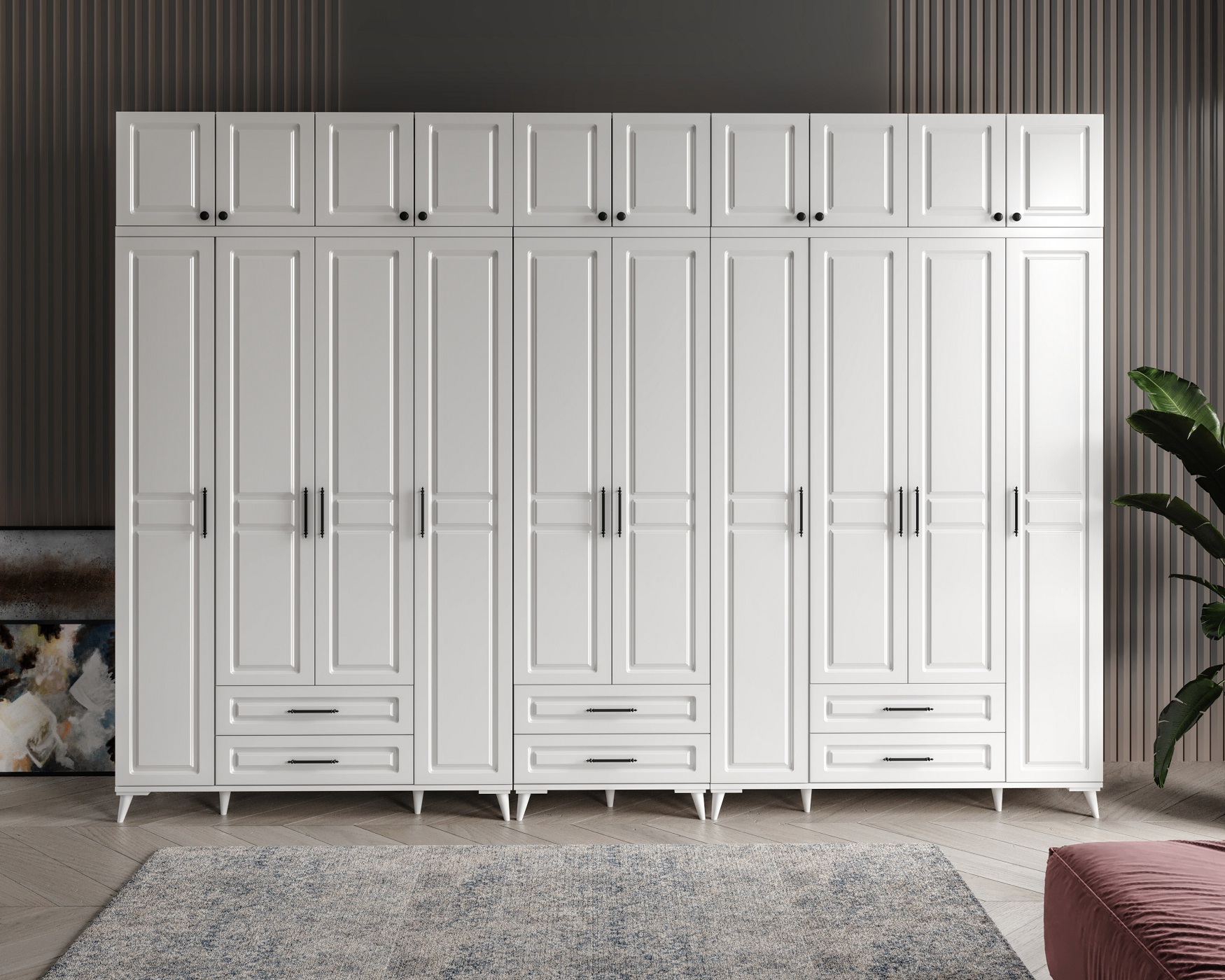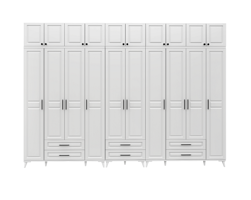 Seronay Mirea 10 Kapaklı Çekmeceli Yüklüklü Beyaz Gardırop, yaşam alanında düzen ve estetiği bir araya getiren fonksiyonel bir gardırop modelidir. Depolama ihtiyacına pratik bir çözüm sunarken modern tasarım dili sayesinde yatak odasına dengeli ve şık bir görünüm kazandırır.