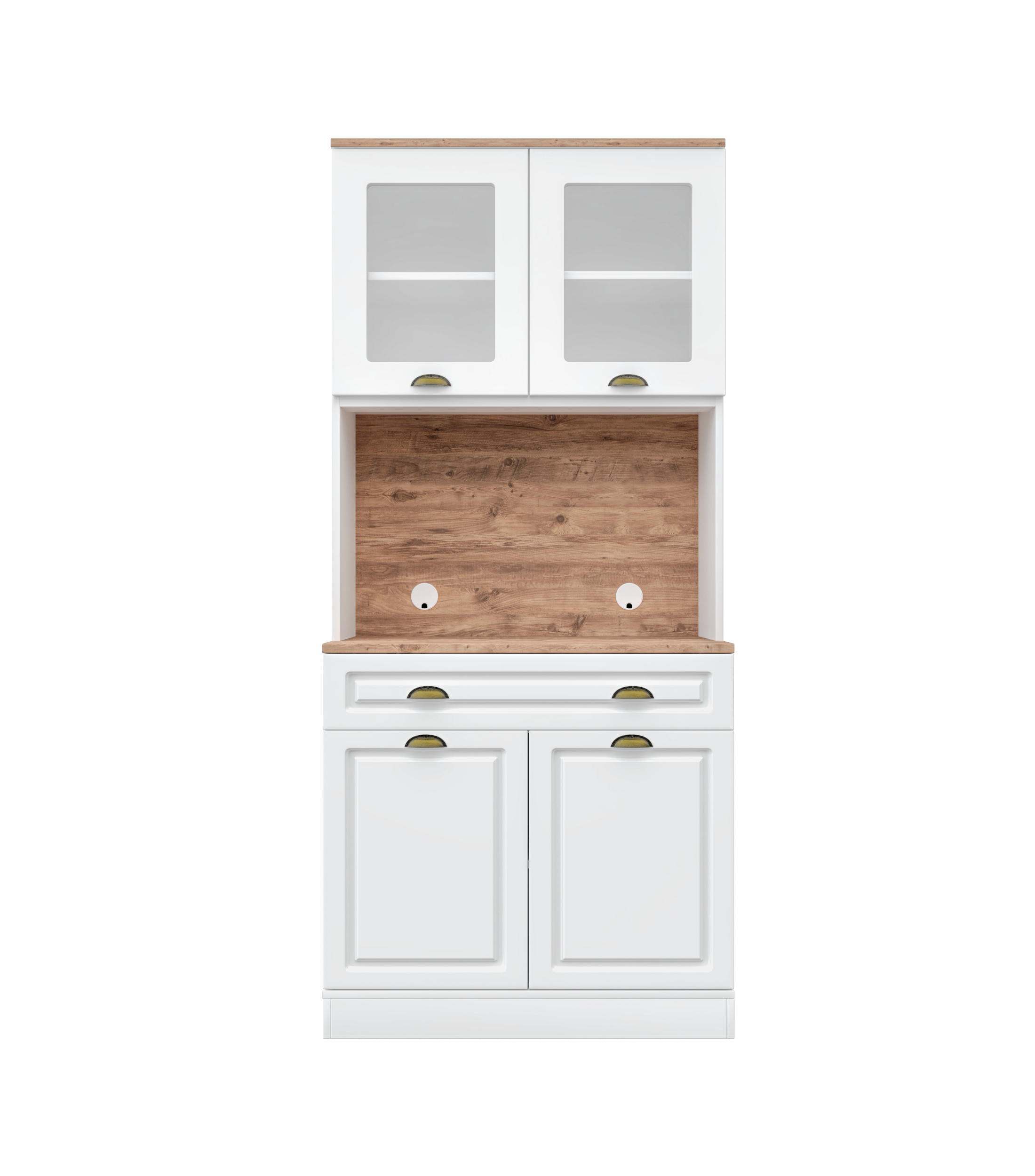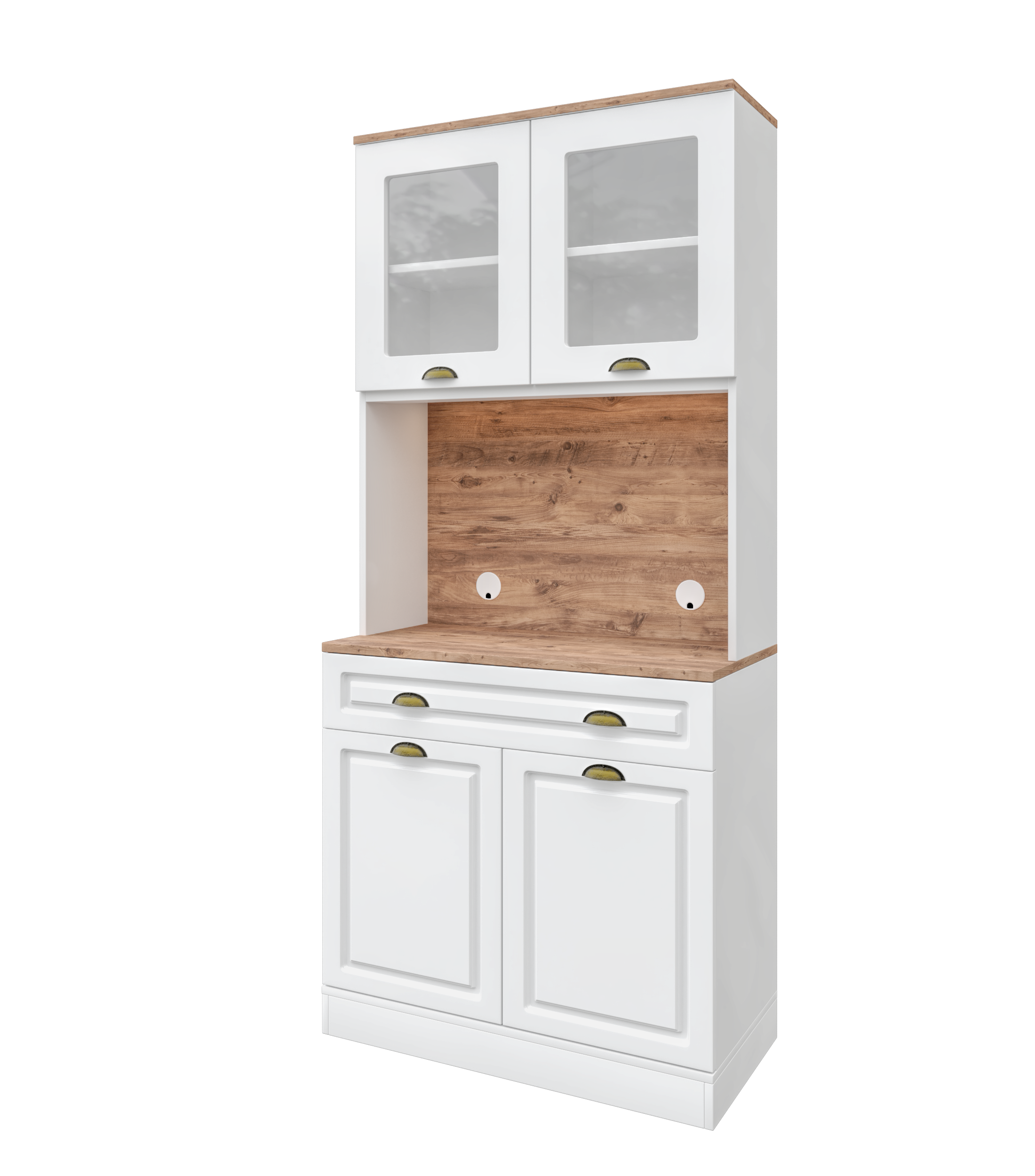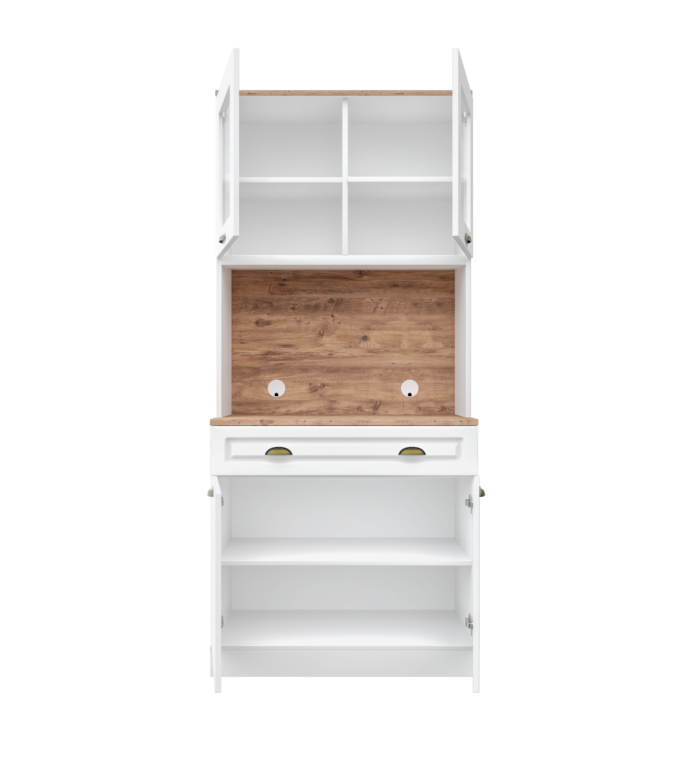- Üst modülde 2 cam kapaklı raflı bölme