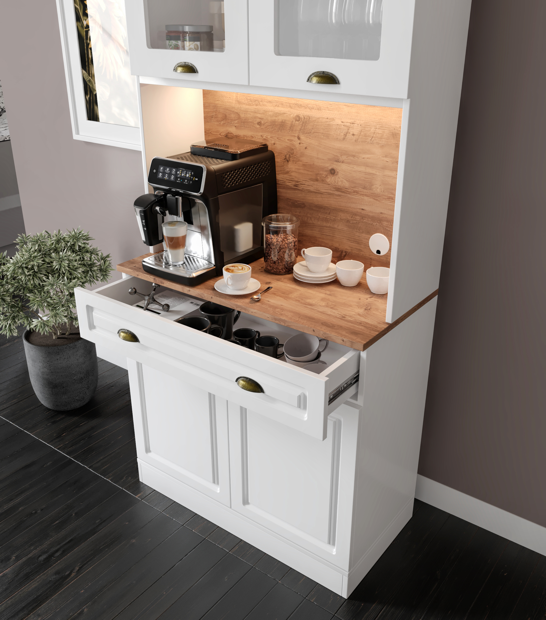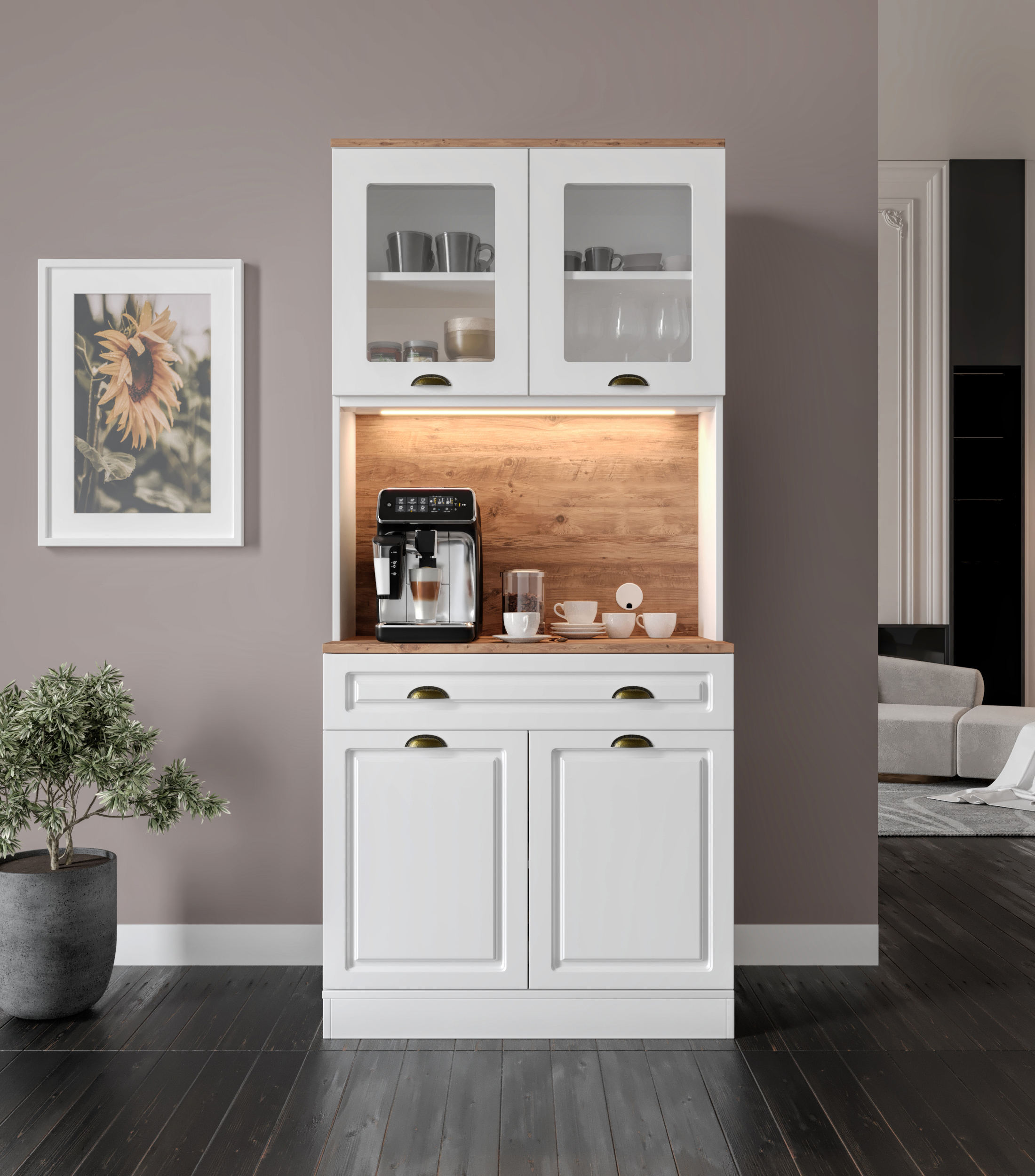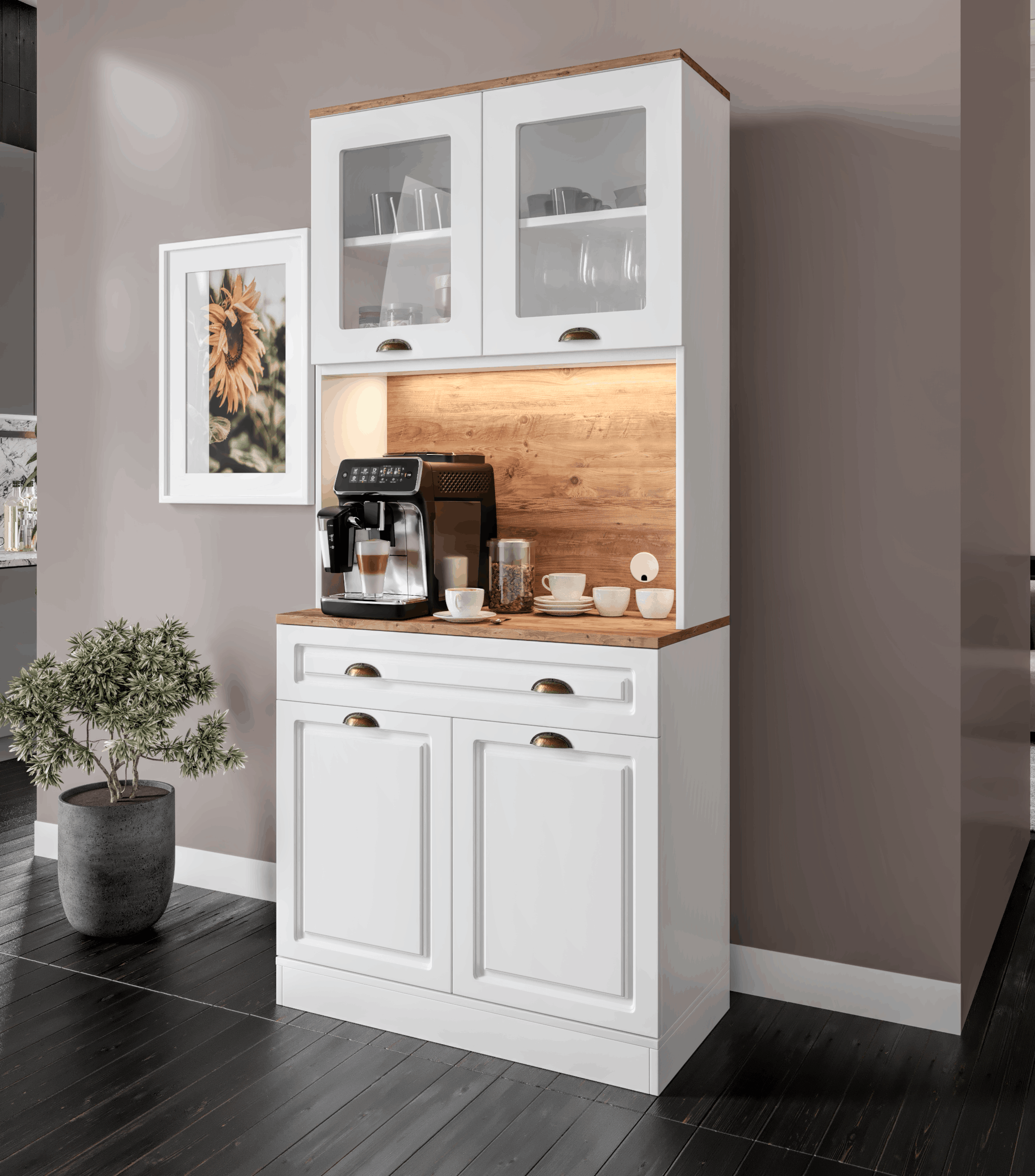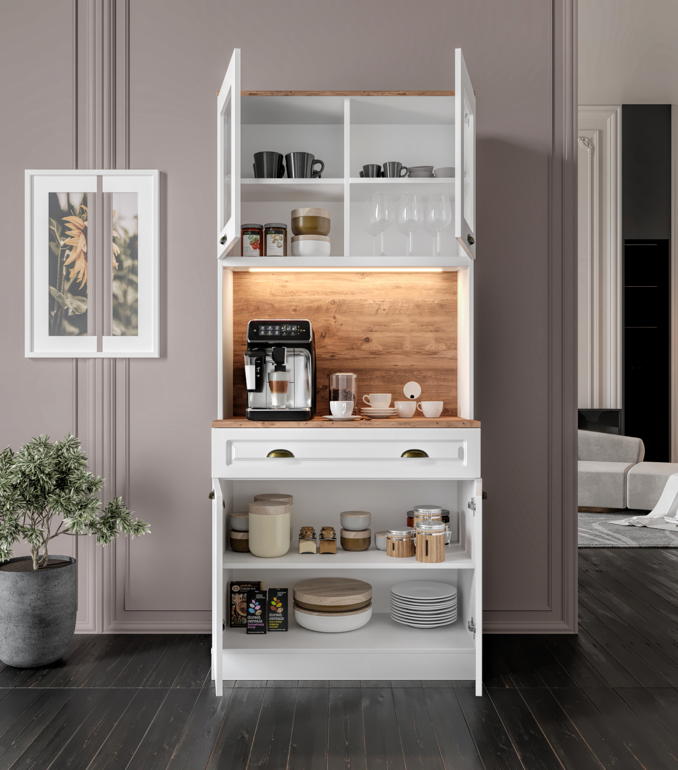 Seronay Mirea 2 Kapaklı Kahve Köşesi – 93 cm MDF, LED Aydınlatmalı, Çok Amaçlı Mutfak ve Airfryer Dolabı, kahve hazırlık alanını düzenli ve şık hale getirmek isteyenler için tasarlanmış modern bir kahve köşesi çözümüdür. Günlük kullanıma uyum sağlayan depolama alanı ve sergileme yüzeyi sayesinde mutfak ya da yaşam alanına düzenli bir görünüm kazandırır.