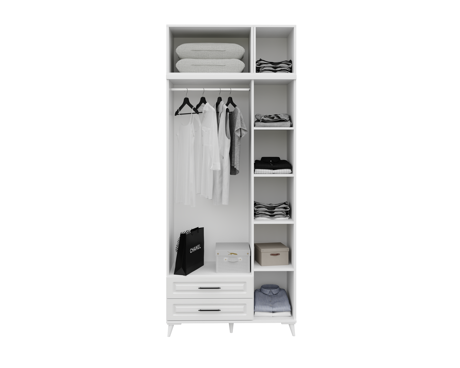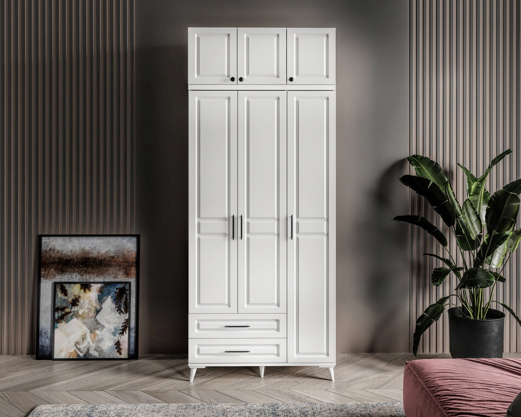 Seronay Mirea 3 Kapaklı 2 Çekmeceli Yüklüklü Beyaz Gardırop, yaşam alanında düzen ve estetiği bir araya getiren fonksiyonel bir gardırop modelidir. Depolama ihtiyacına pratik bir çözüm sunarken modern tasarım dili sayesinde yatak odasına dengeli ve şık bir görünüm kazandırır.