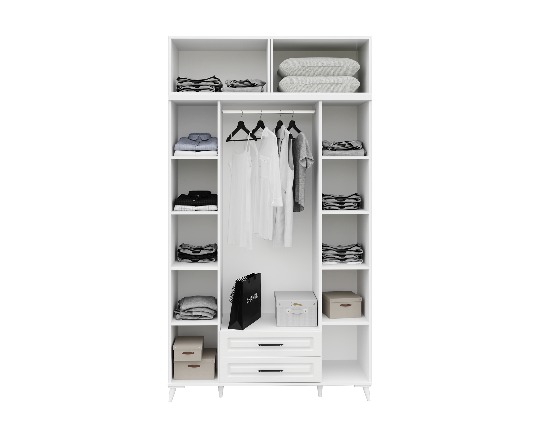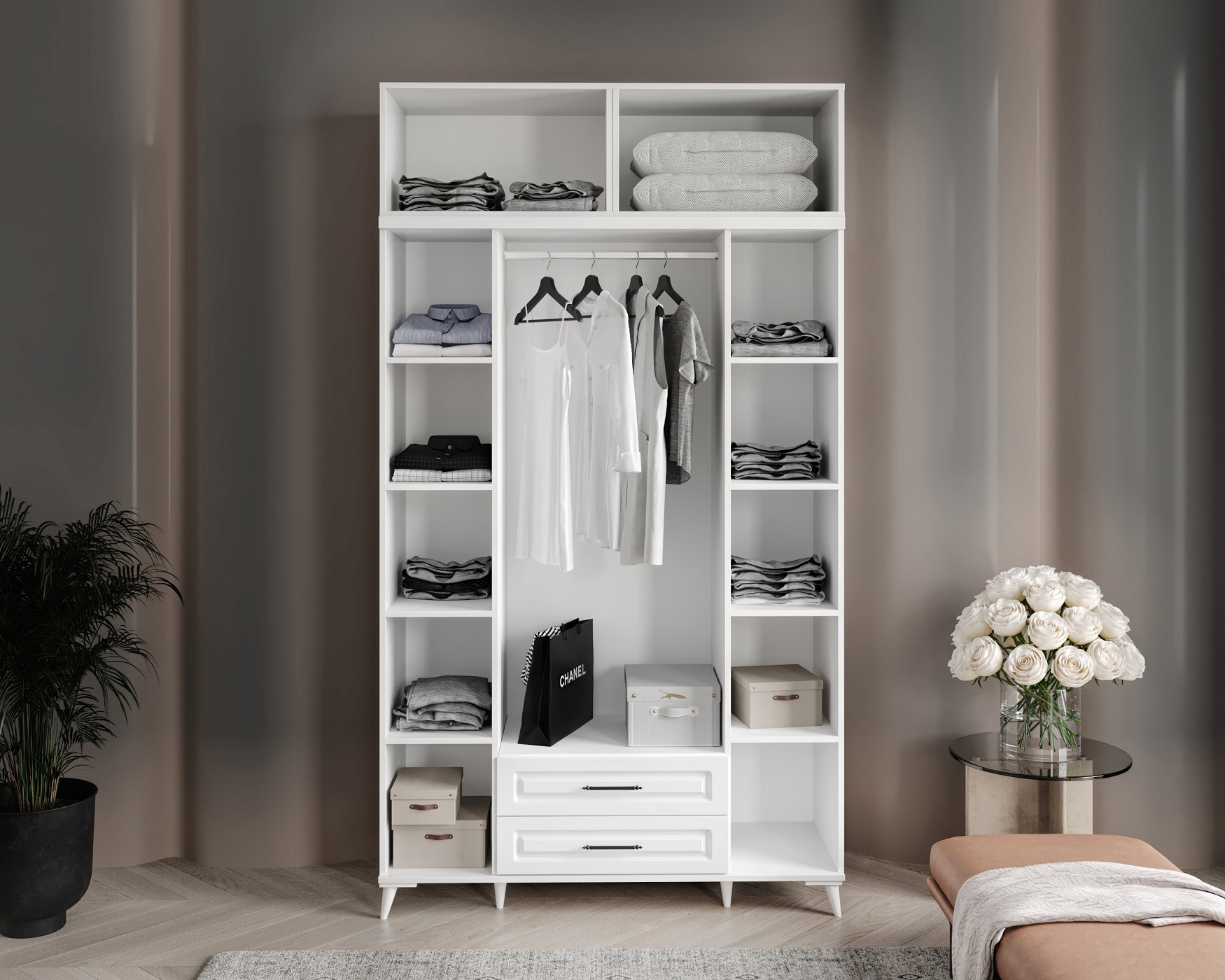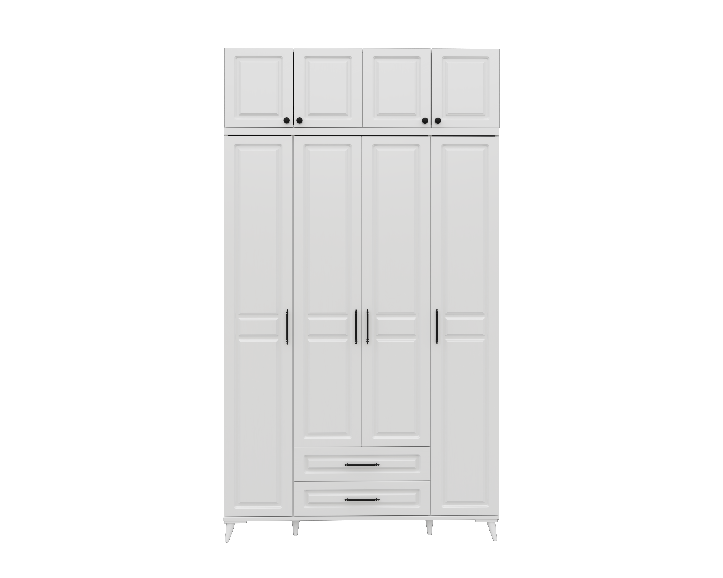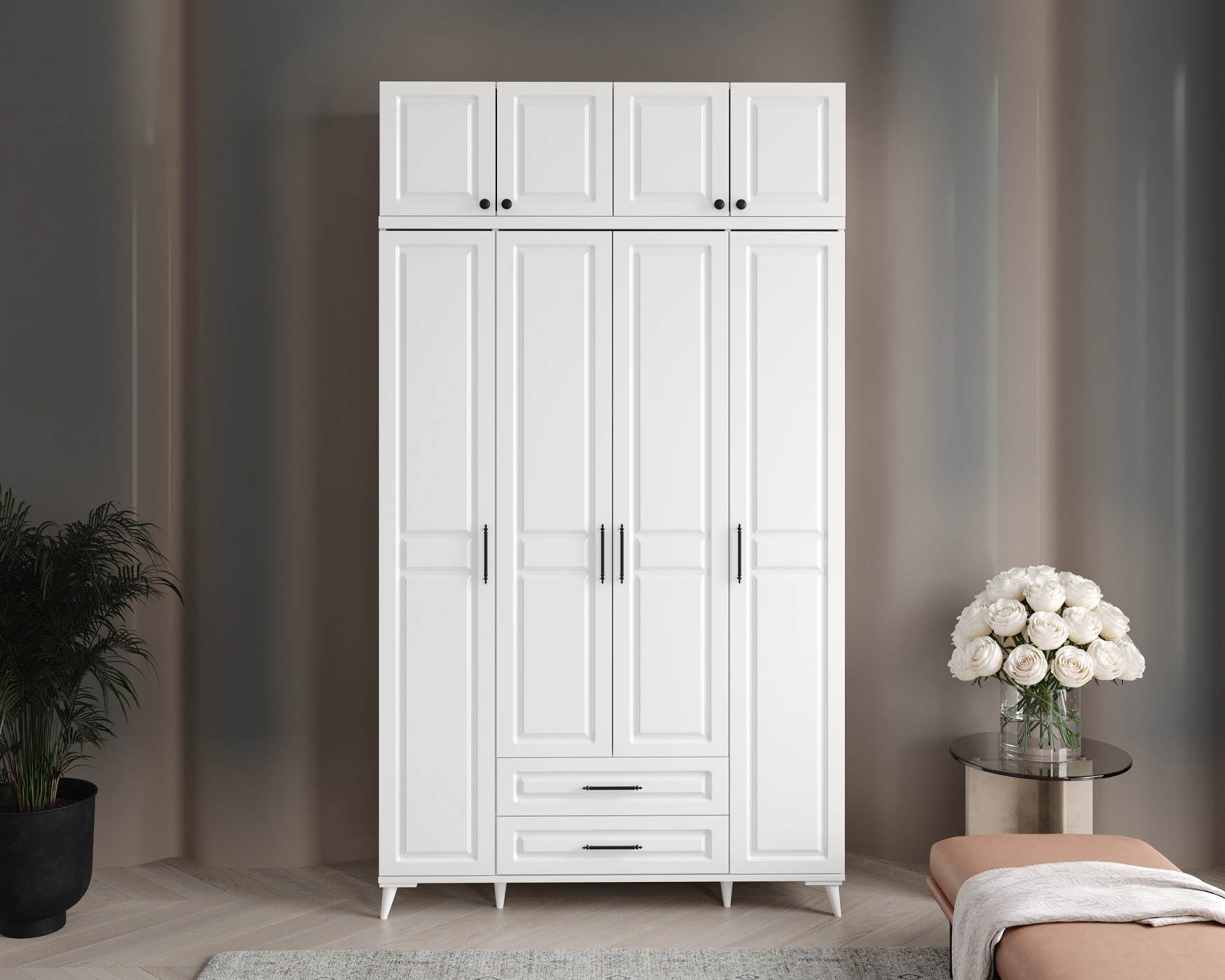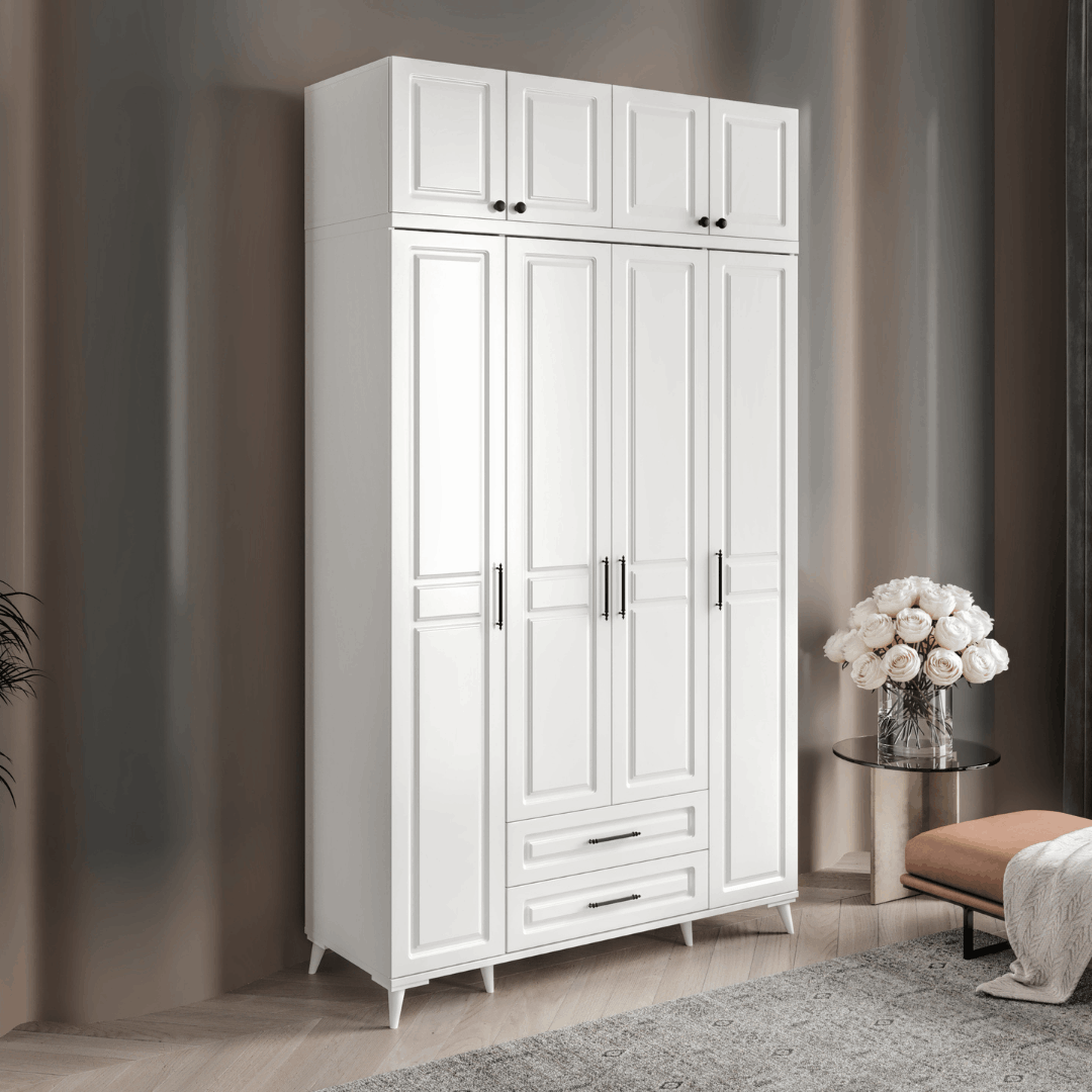 Seronay Mirea 4 Kapaklı 2 Çekmeceli Yüklüklü Beyaz Gardırop, yaşam alanında düzen ve estetiği bir araya getiren fonksiyonel bir gardırop modelidir. Depolama ihtiyacına pratik bir çözüm sunarken modern tasarım dili sayesinde yatak odasına dengeli ve şık bir görünüm kazandırır.