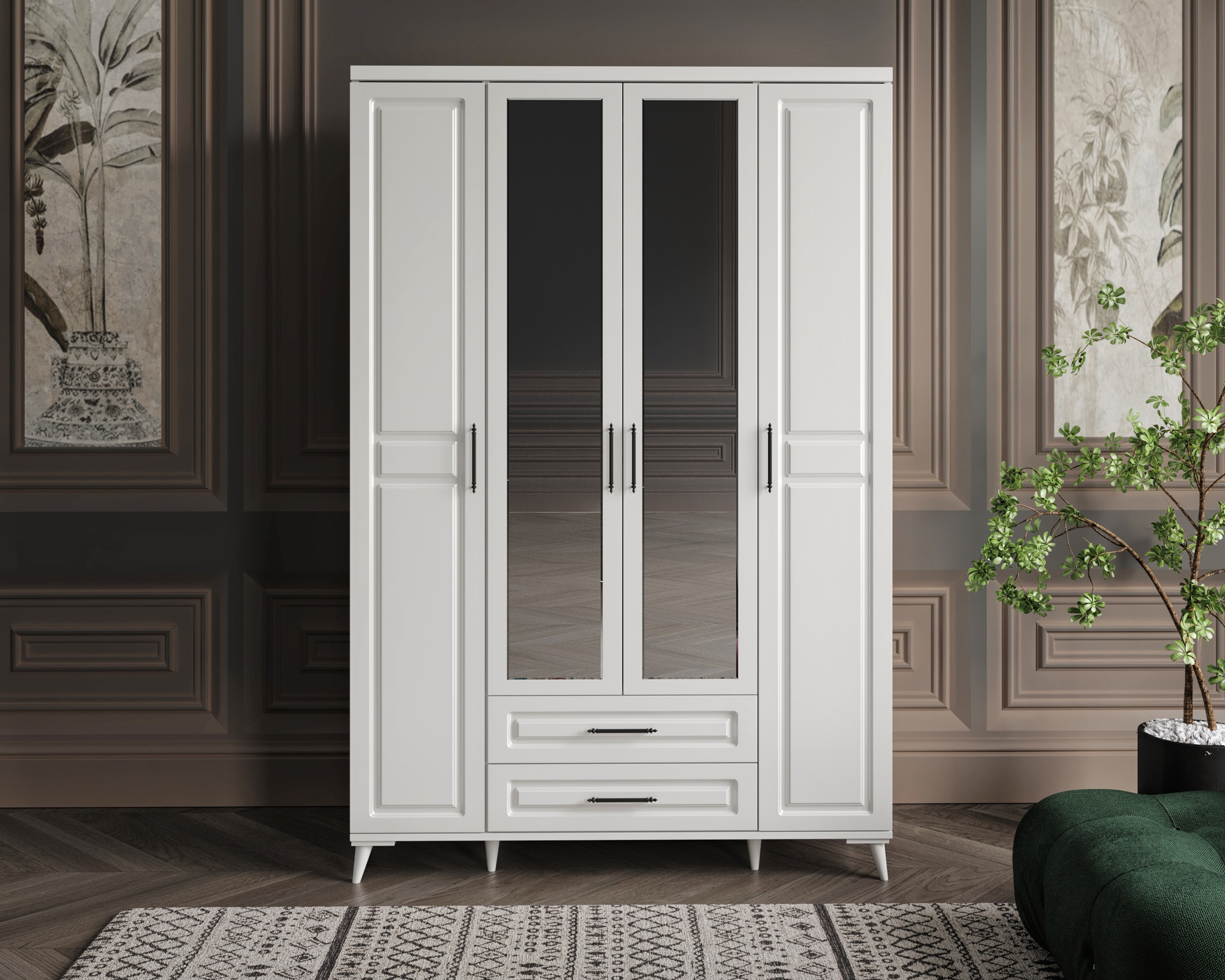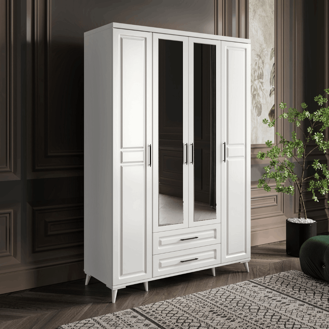 Seronay Mirea 4 Kapaklı Aynalı Beyaz Gardırop, yaşam alanında düzen ve estetiği bir araya getiren fonksiyonel bir gardırop modelidir. Depolama ihtiyacına pratik bir çözüm sunarken modern tasarım dili sayesinde yatak odasına dengeli ve şık bir görünüm kazandırır.