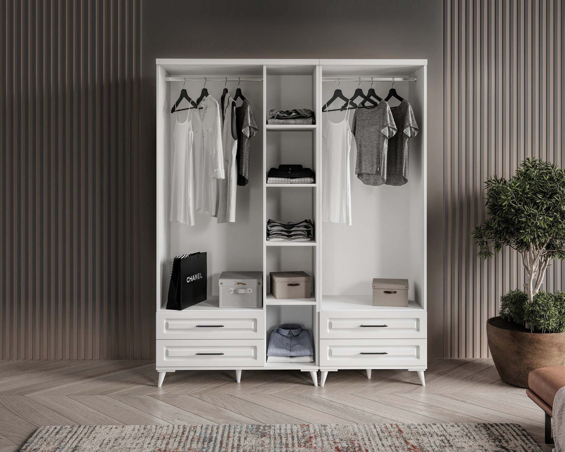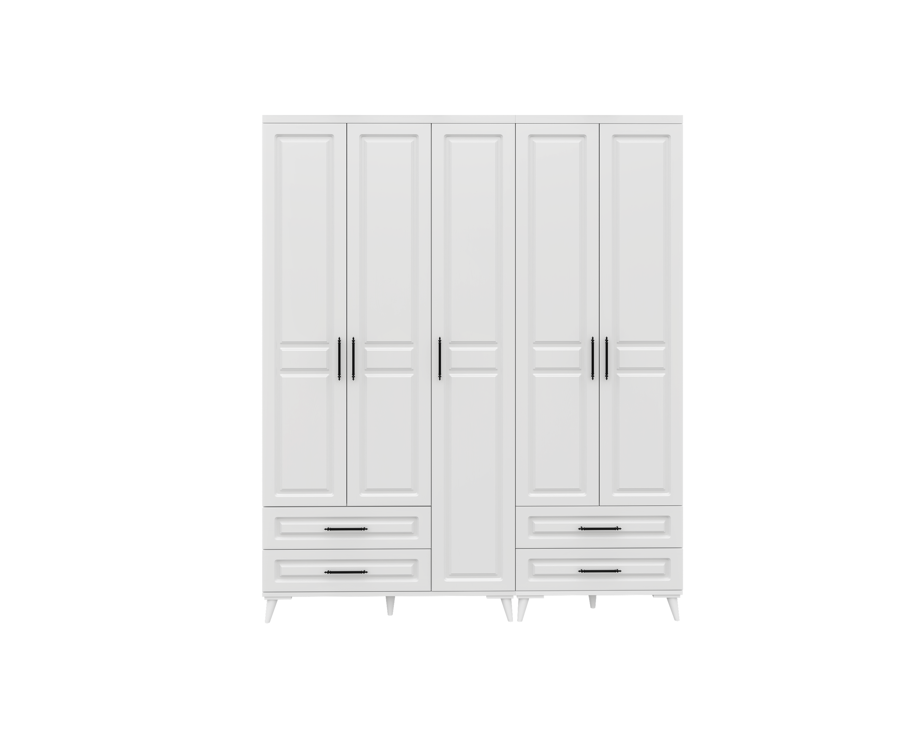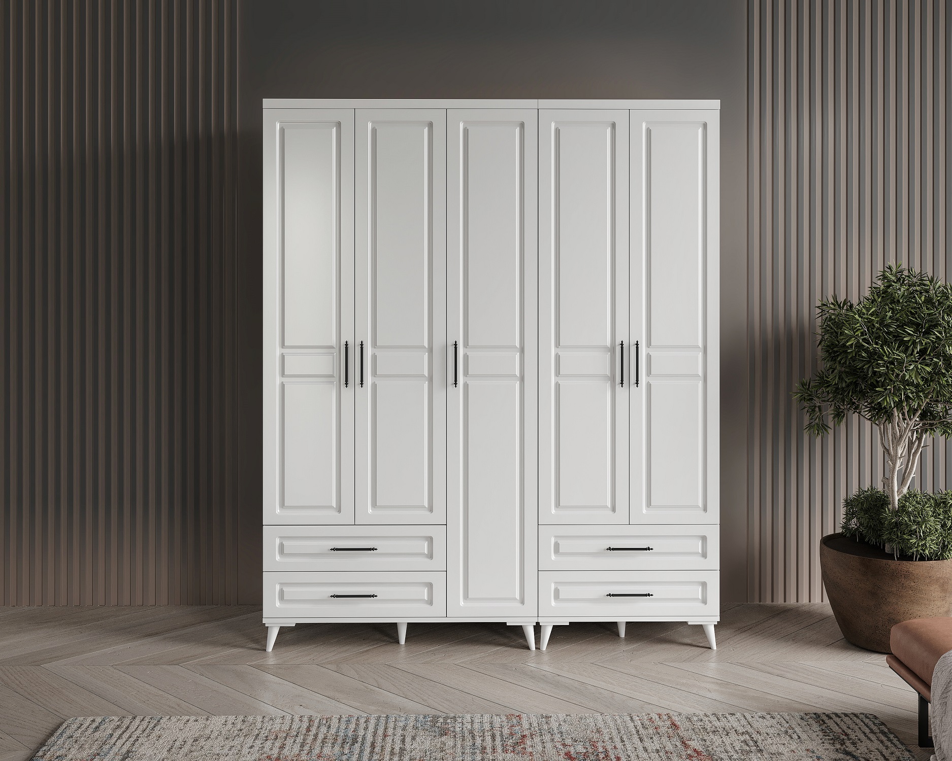 Seronay Mirea 5 Kapaklı 4 Çekmeceli Beyaz Gardırop, yaşam alanında düzen ve estetiği bir araya getiren fonksiyonel bir gardırop modelidir. Depolama ihtiyacına pratik bir çözüm sunarken modern tasarım dili sayesinde yatak odasına dengeli ve şık bir görünüm kazandırır.