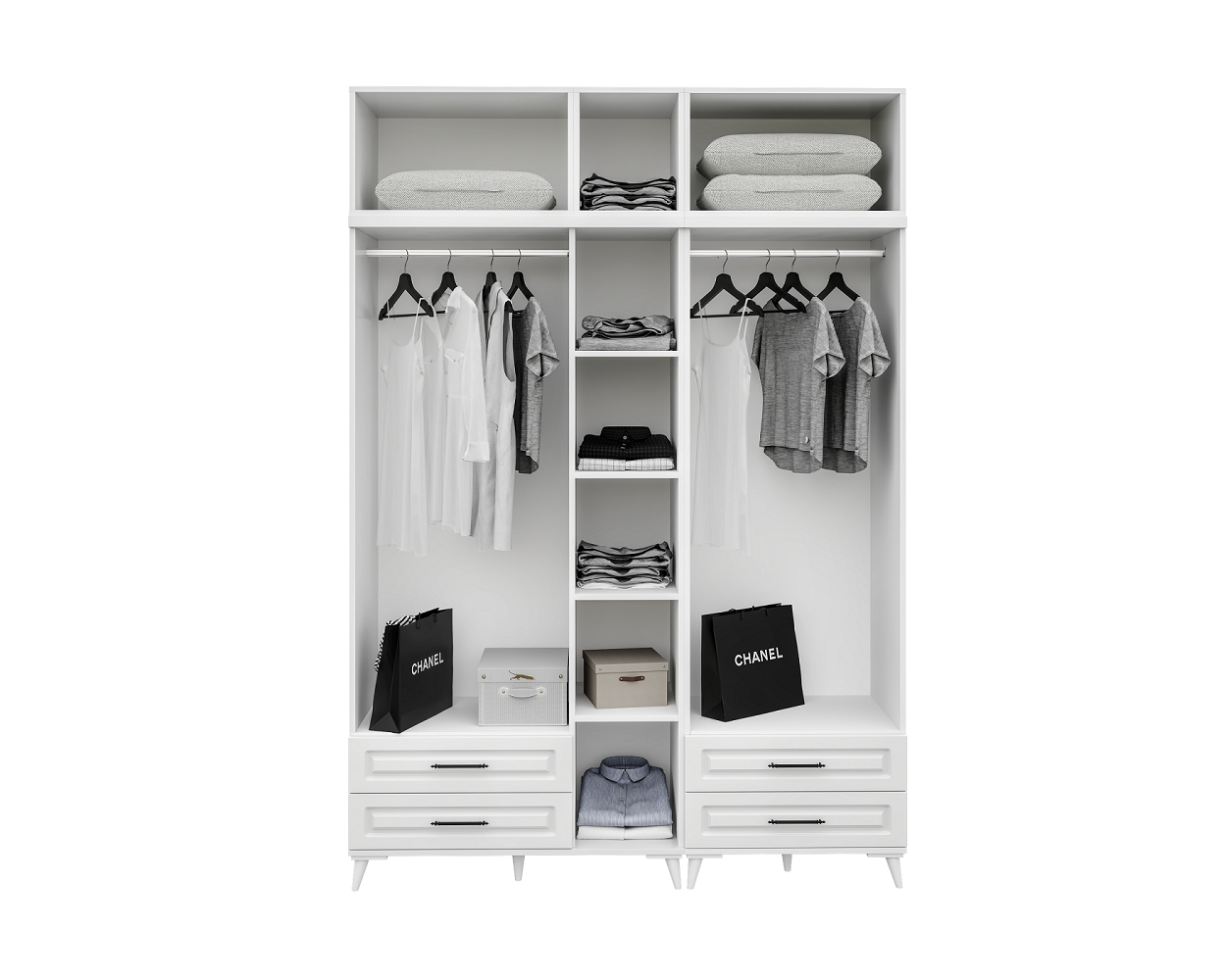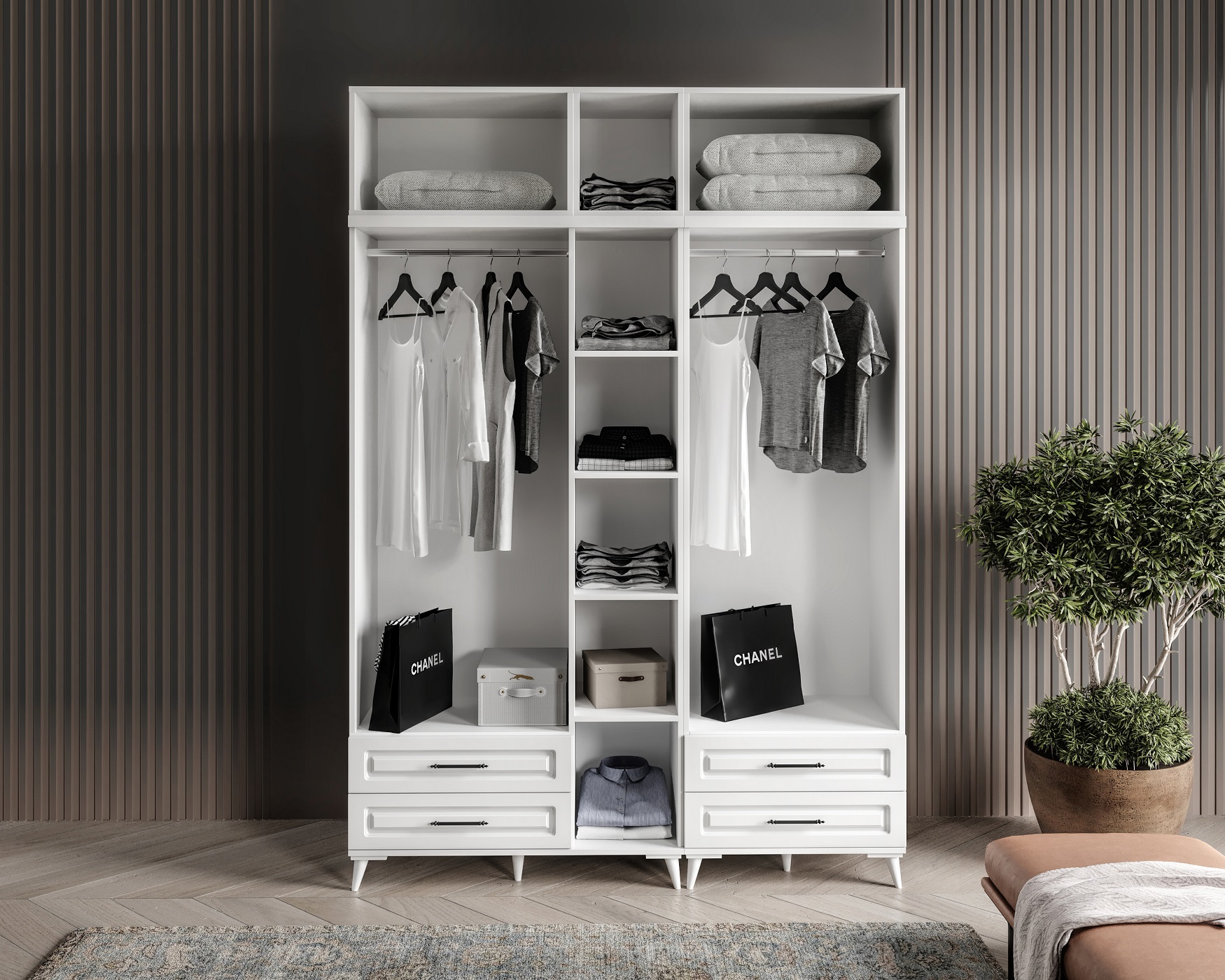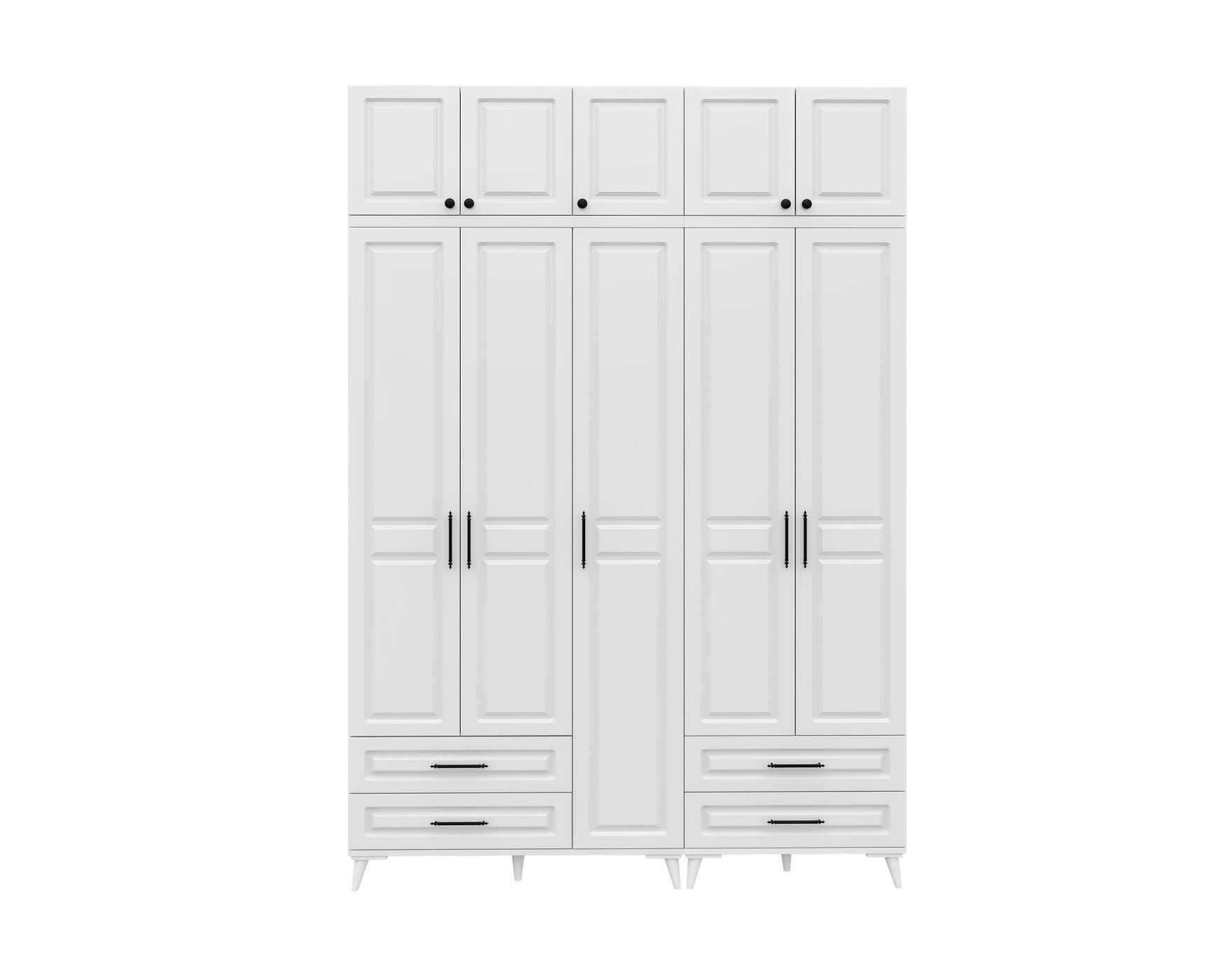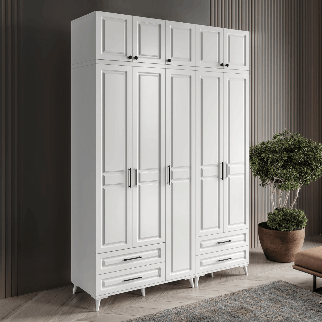 Seronay Mirea 5 Kapaklı 4 Çekmeceli Yüklüklü Beyaz Gardırop, yaşam alanında düzen ve estetiği bir araya getiren fonksiyonel bir gardırop modelidir. Depolama ihtiyacına pratik bir çözüm sunarken modern tasarım dili sayesinde yatak odasına dengeli ve şık bir görünüm kazandırır.