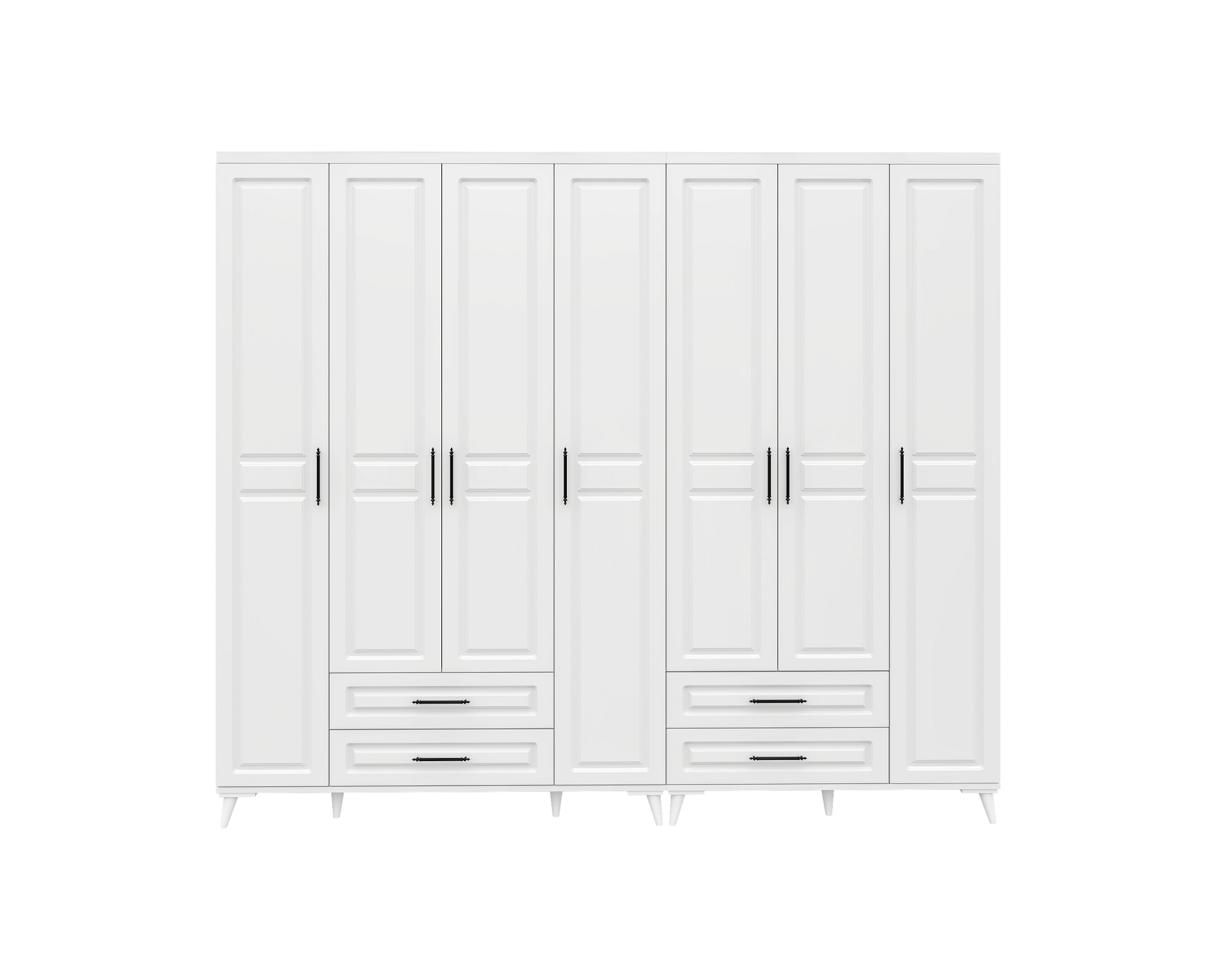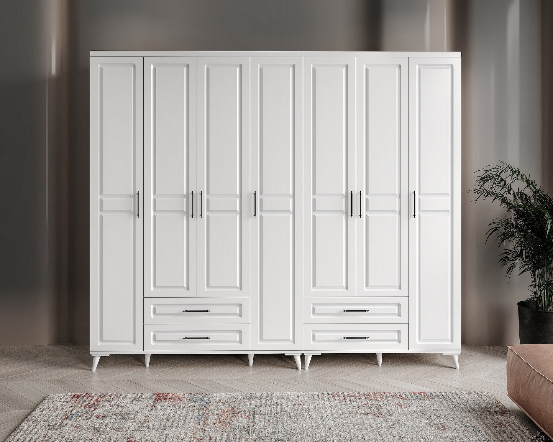 Seronay Mirea 7 Kapaklı 4 Çekmeceli Beyaz Gardırop, yaşam alanında düzen ve estetiği bir araya getiren fonksiyonel bir gardırop modelidir. Depolama ihtiyacına pratik bir çözüm sunarken modern tasarım dili sayesinde yatak odasına dengeli ve şık bir görünüm kazandırır.