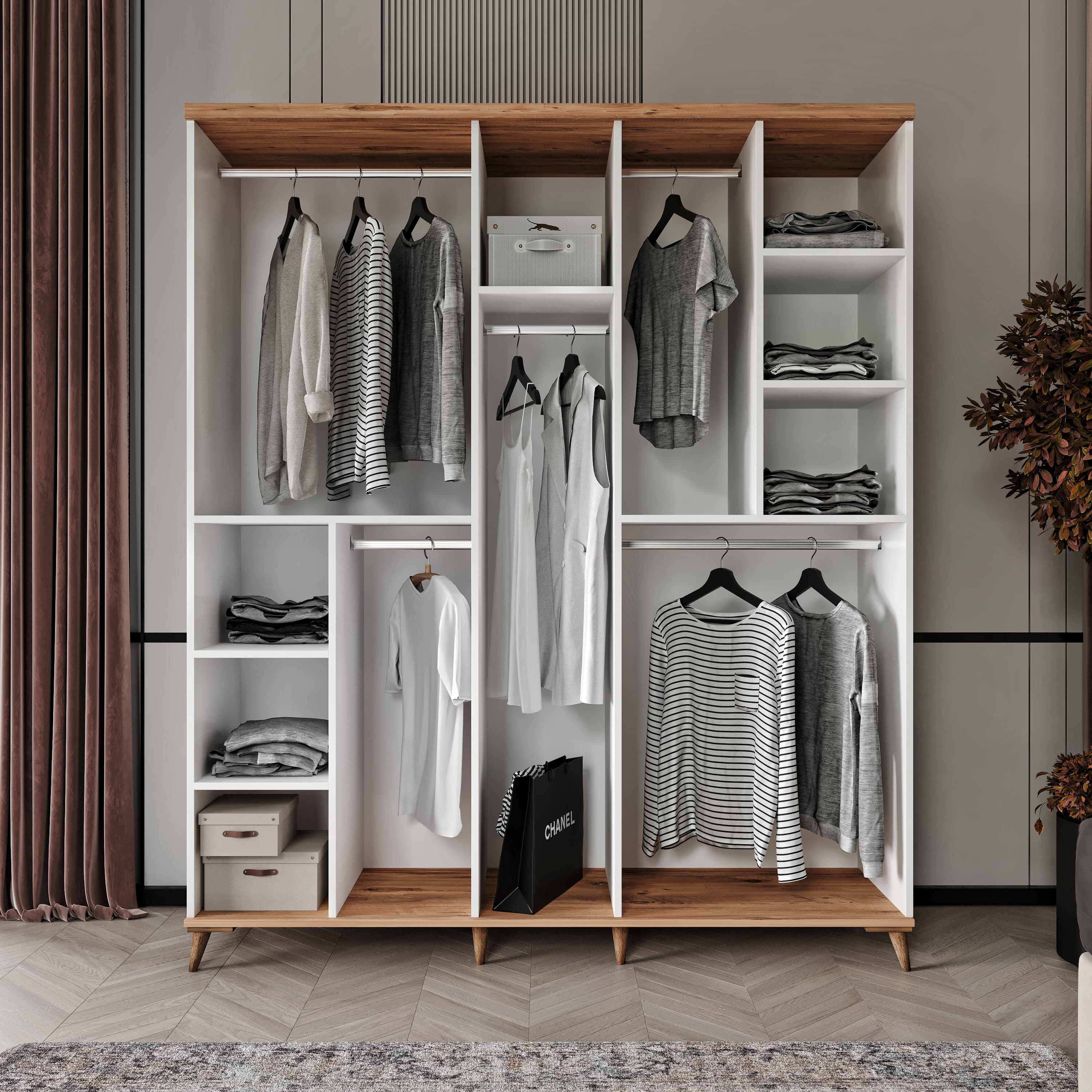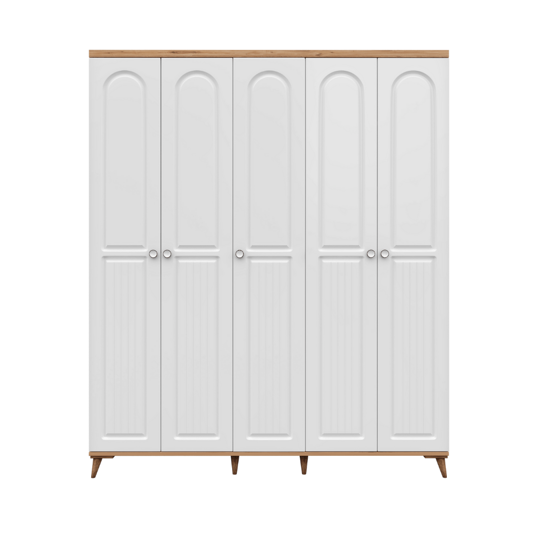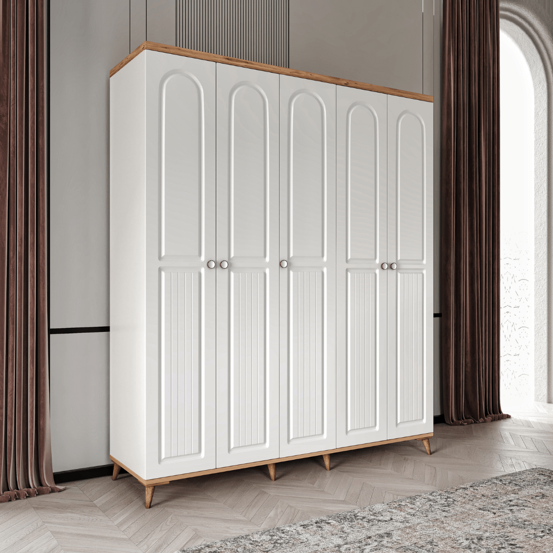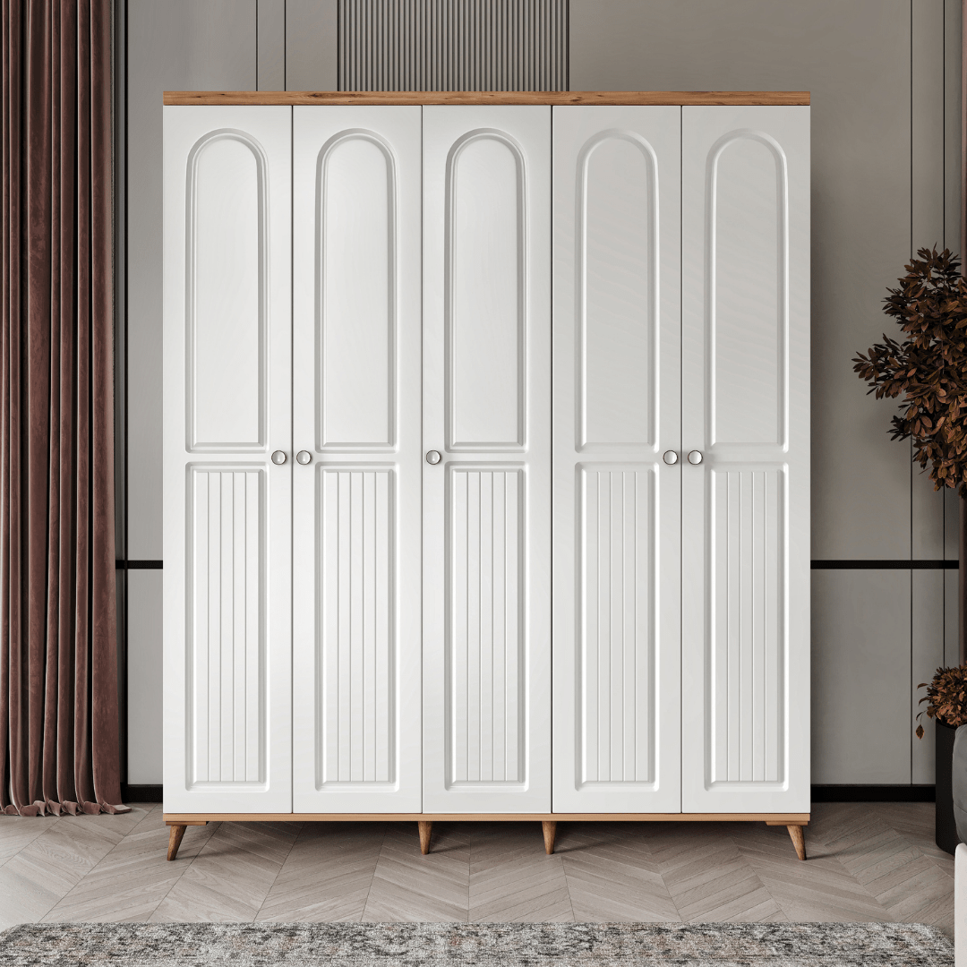Seronay Mora 5 Kapaklı Gardırop, yaşam alanında düzen ve estetiği bir araya getiren fonksiyonel bir gardırop modelidir. Depolama ihtiyacına pratik bir çözüm sunarken modern tasarım dili sayesinde yatak odasına dengeli ve şık bir görünüm kazandırır.