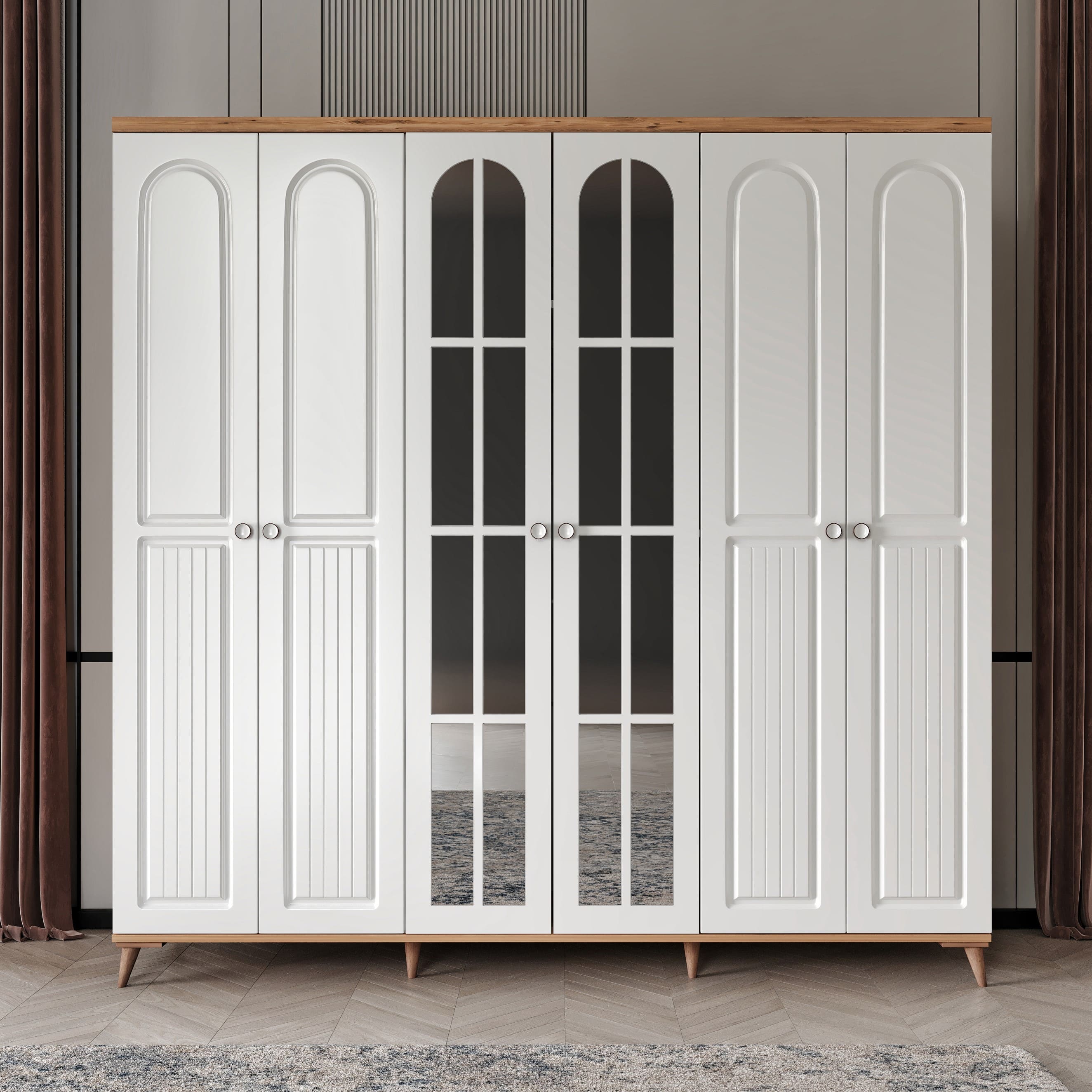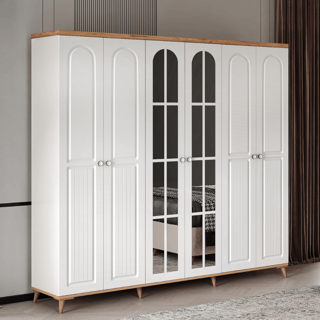 Seronay Mora 6 Kapaklı Aynalı Gardırop, yaşam alanında düzen ve estetiği bir araya getiren fonksiyonel bir gardırop modelidir. Depolama ihtiyacına pratik bir çözüm sunarken modern tasarım dili sayesinde yatak odasına dengeli ve şık bir görünüm kazandırır.