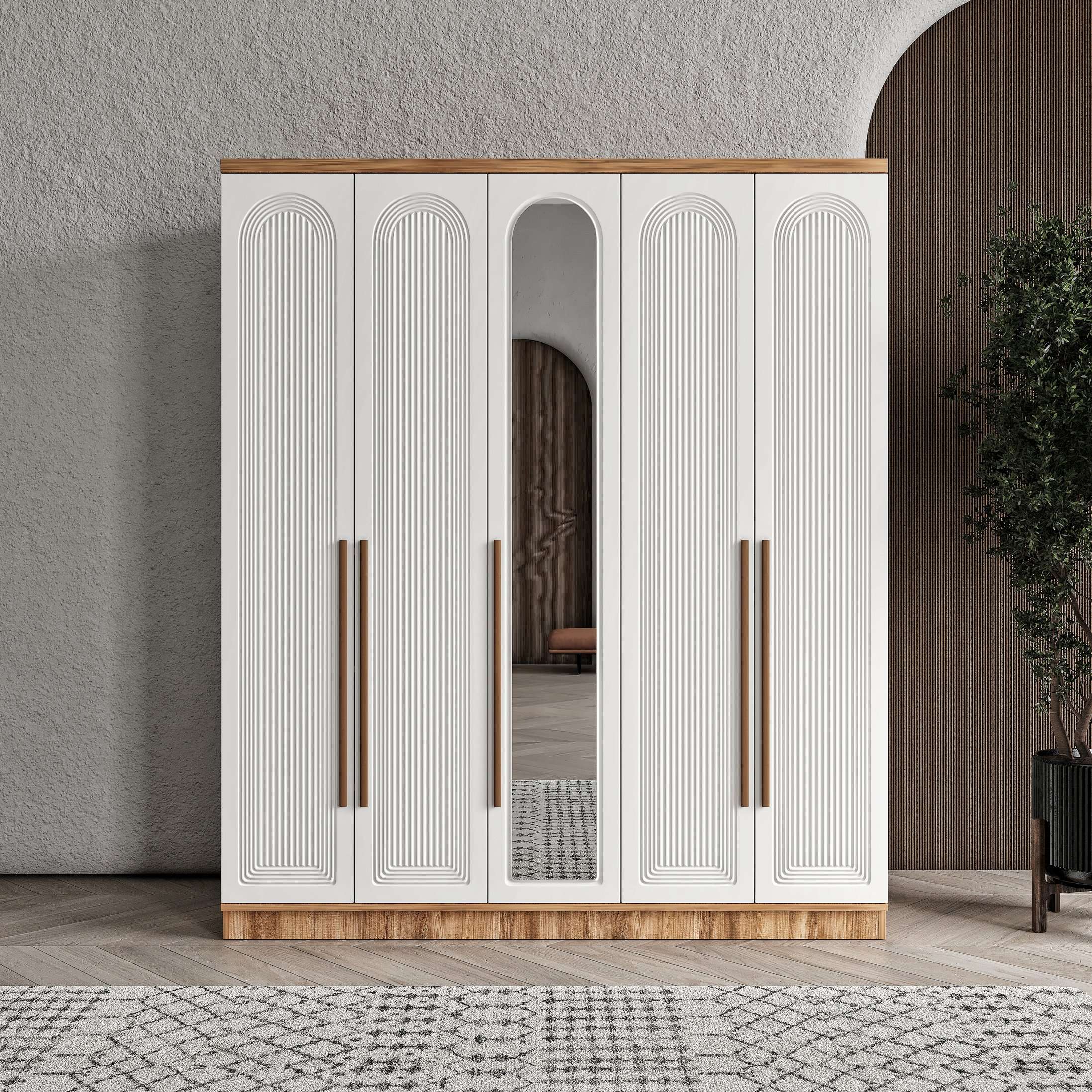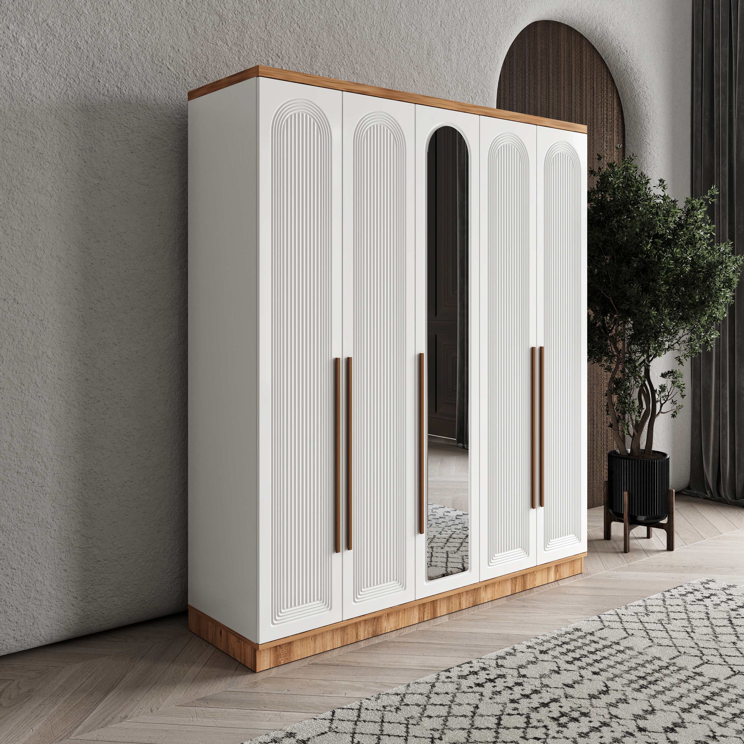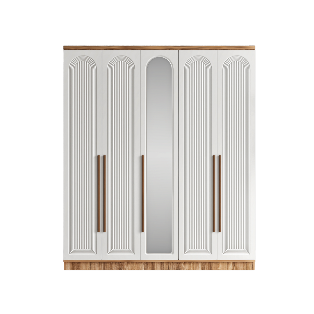 Seronay Rosela 5 Kapaklı Aynalı Gardırop, yaşam alanında düzen ve estetiği bir araya getiren fonksiyonel bir gardırop modelidir. Depolama ihtiyacına pratik bir çözüm sunarken modern tasarım dili sayesinde yatak odasına dengeli ve şık bir görünüm kazandırır.