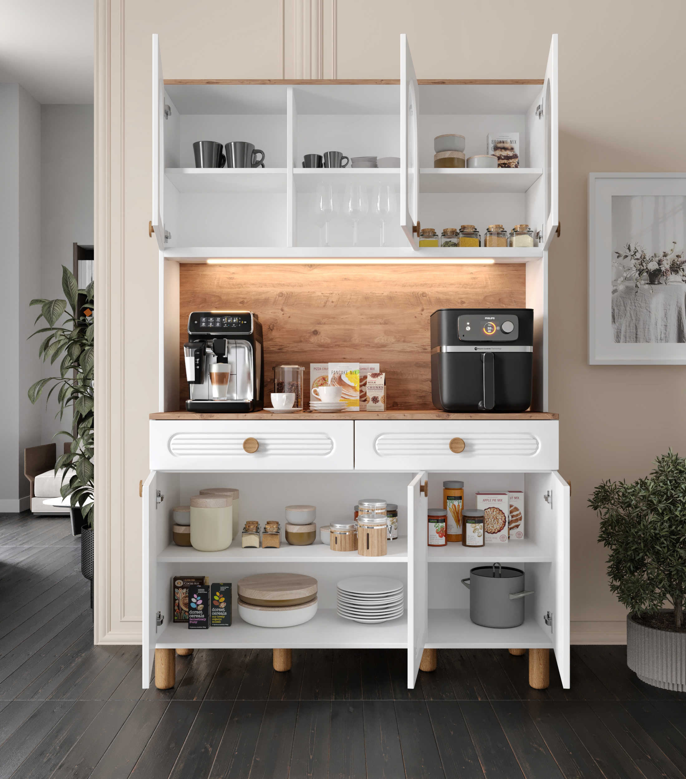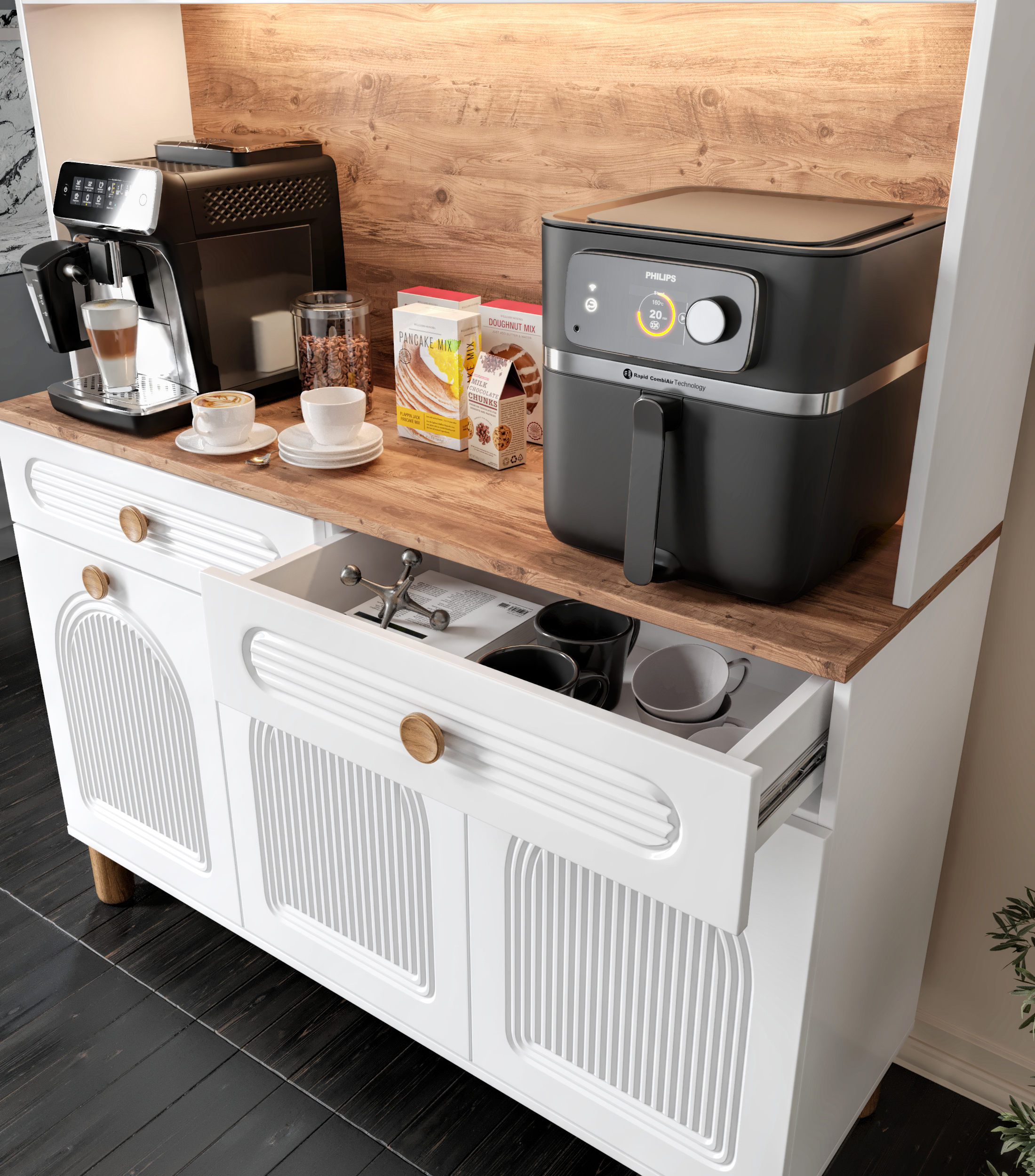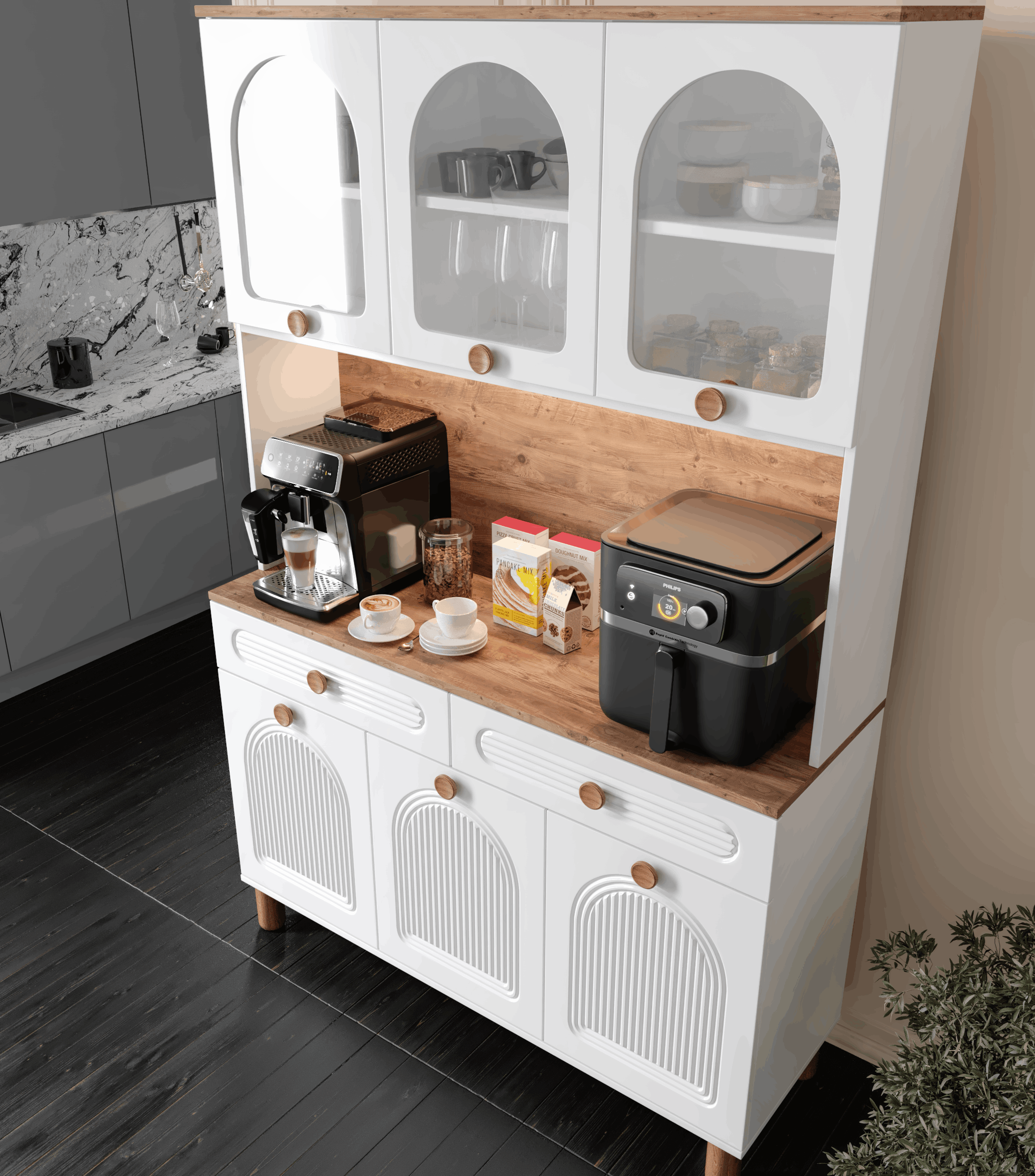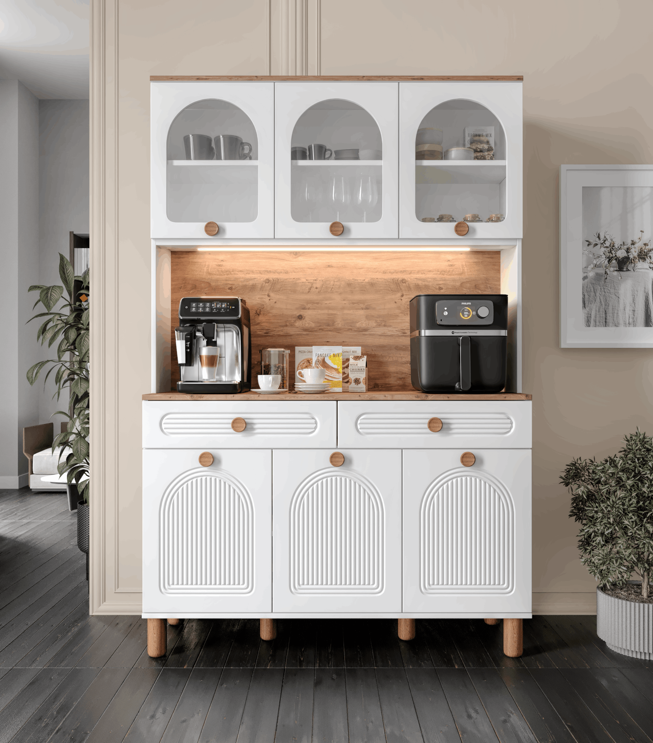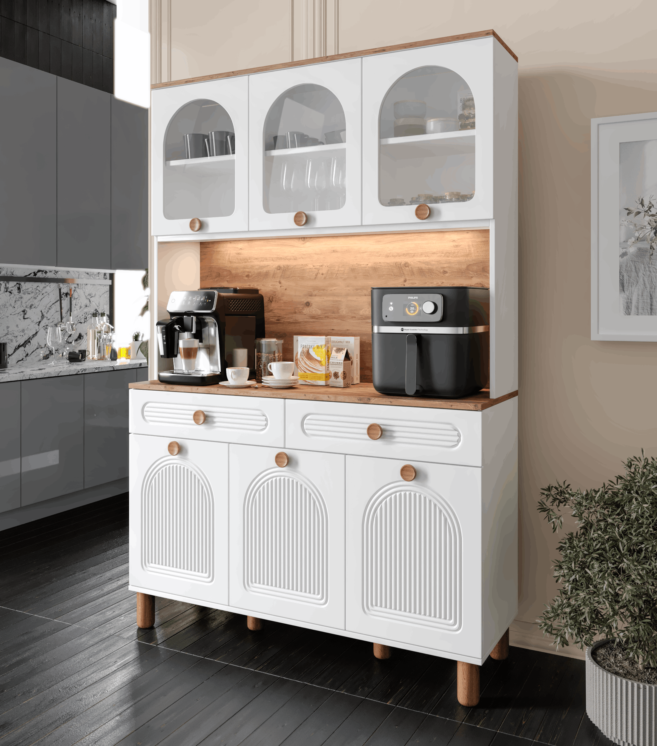 Seronay Rosela Kahve Köşesi - 140 cm MDF Mutfak Dolabı - LED Aydınlatmalı -, kahve hazırlık alanını düzenli ve şık hale getirmek isteyenler için tasarlanmış modern bir kahve köşesi çözümüdür. Günlük kullanıma uyum sağlayan depolama alanı ve sergileme yüzeyi sayesinde mutfak ya da yaşam alanına düzenli bir görünüm kazandırır.