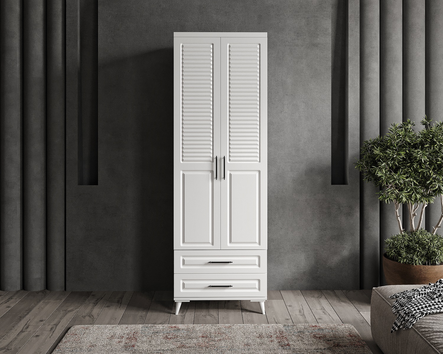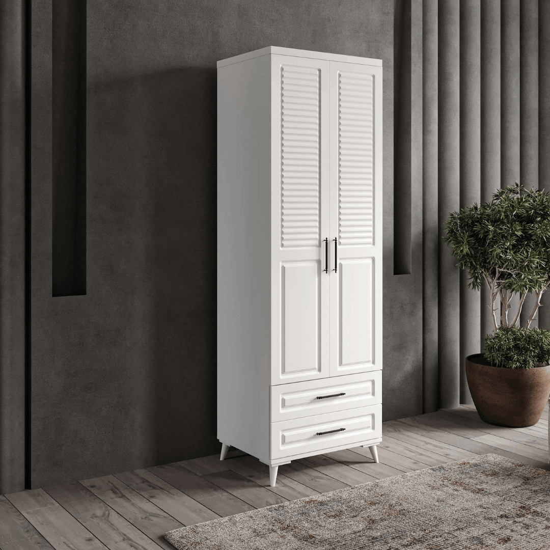 Seronay Valen 2 Kapaklı Çekmeceli Beyaz Gardırop, yaşam alanında düzen ve estetiği bir araya getiren fonksiyonel bir gardırop modelidir. Depolama ihtiyacına pratik bir çözüm sunarken modern tasarım dili sayesinde yatak odasına dengeli ve şık bir görünüm kazandırır.