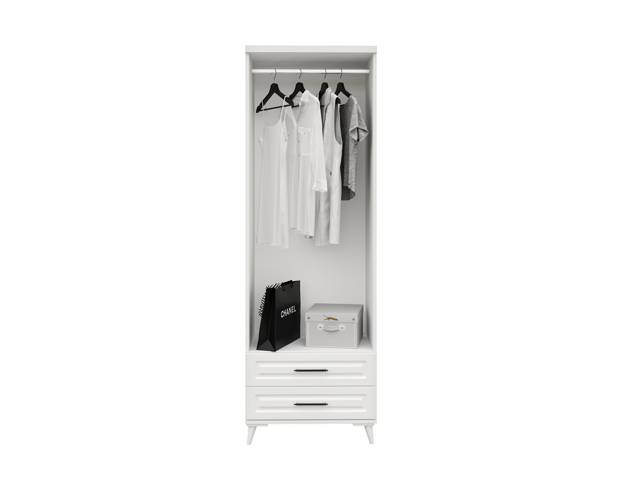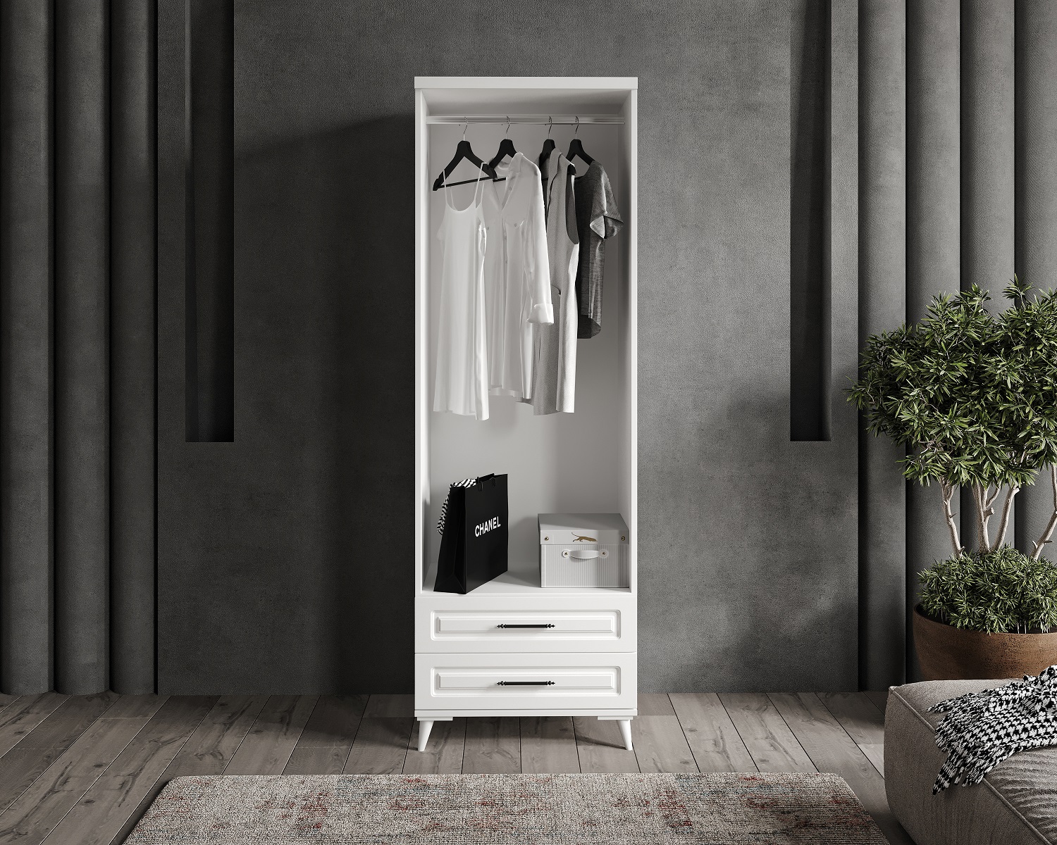 - İç tasarım: askı borusu, raf bölmeleri ve çekmece kombinasyonu