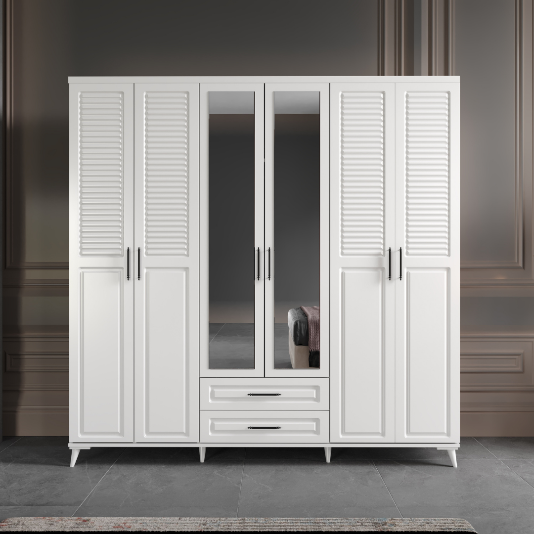 Seronay Valen 6 Kapaklı Aynalı Beyaz Gardırop, yaşam alanında düzen ve estetiği bir araya getiren fonksiyonel bir gardırop modelidir. Depolama ihtiyacına pratik bir çözüm sunarken modern tasarım dili sayesinde yatak odasına dengeli ve şık bir görünüm kazandırır.