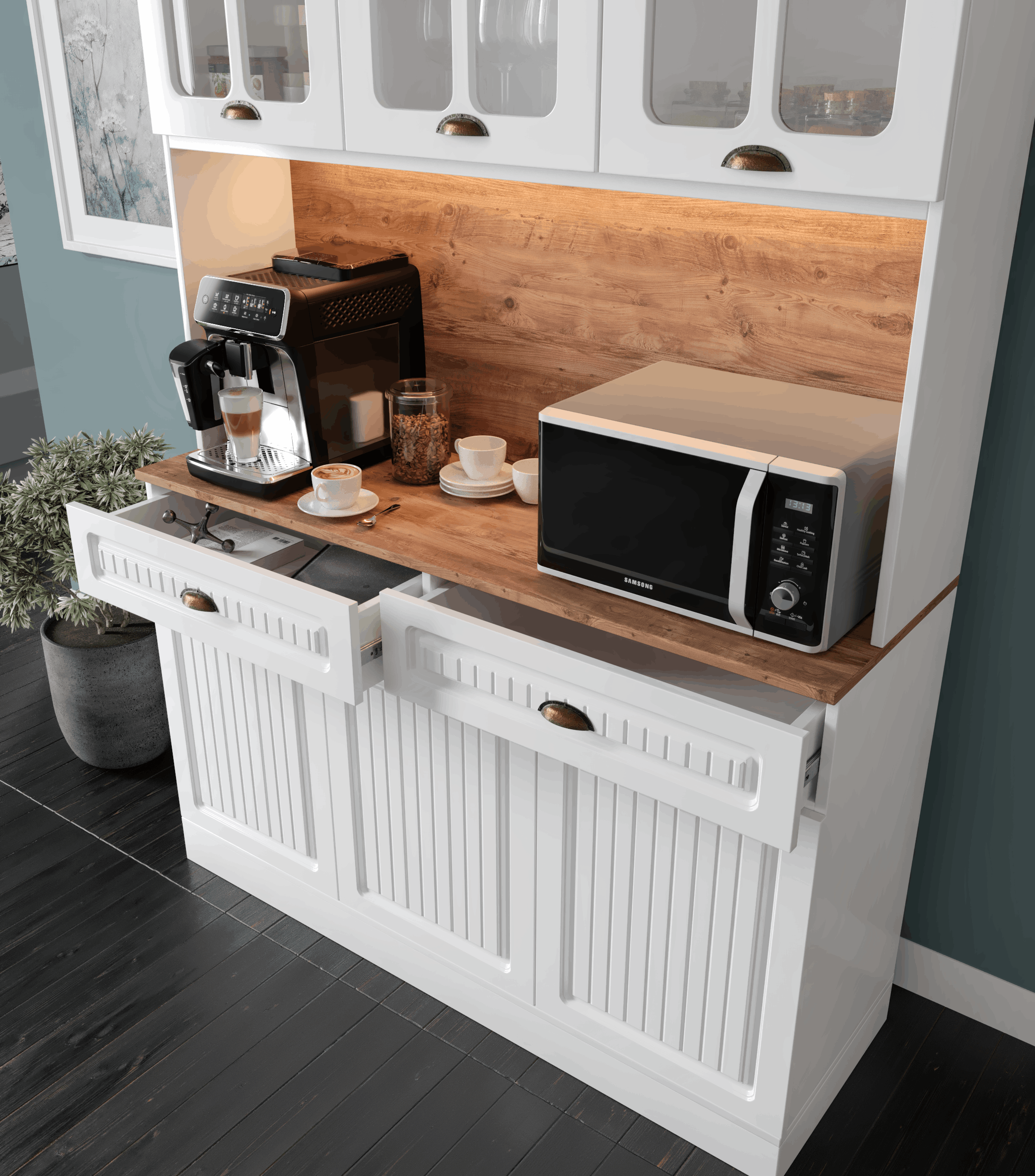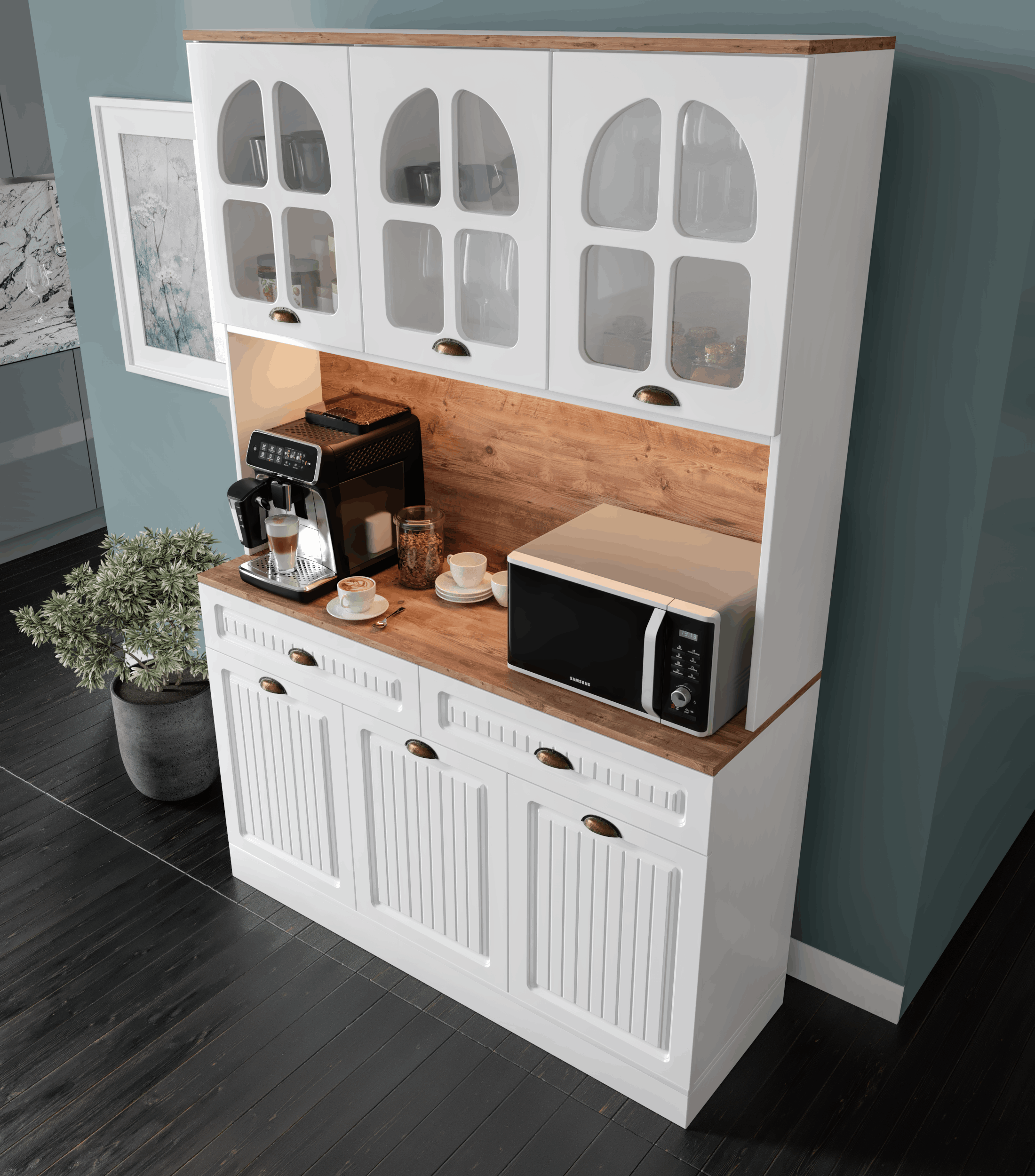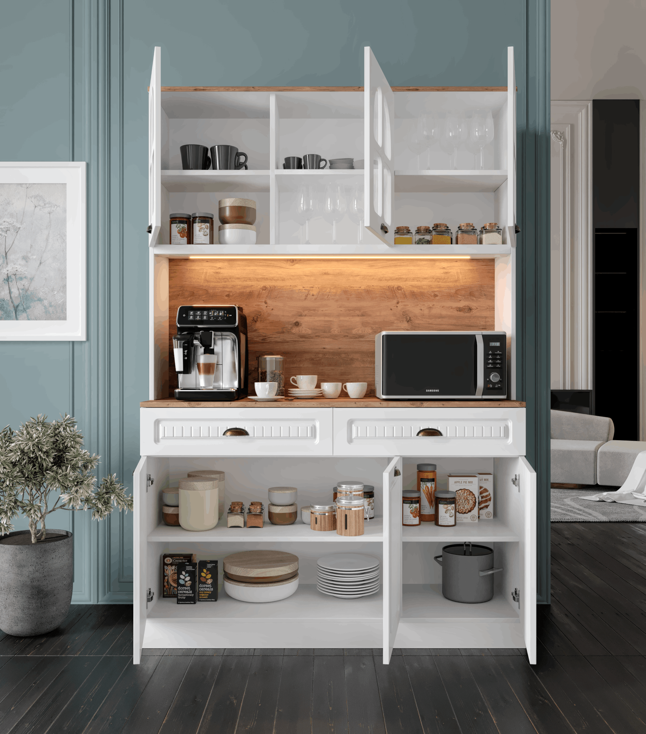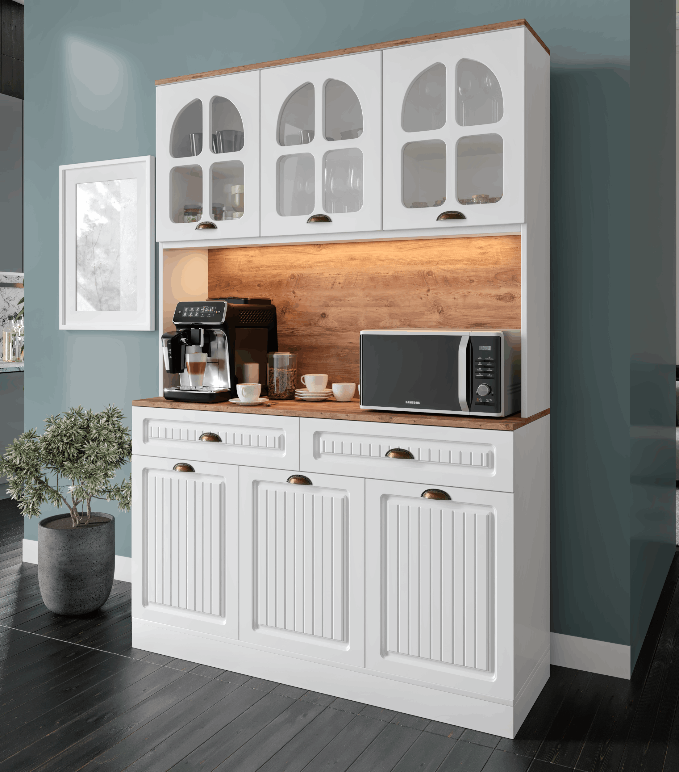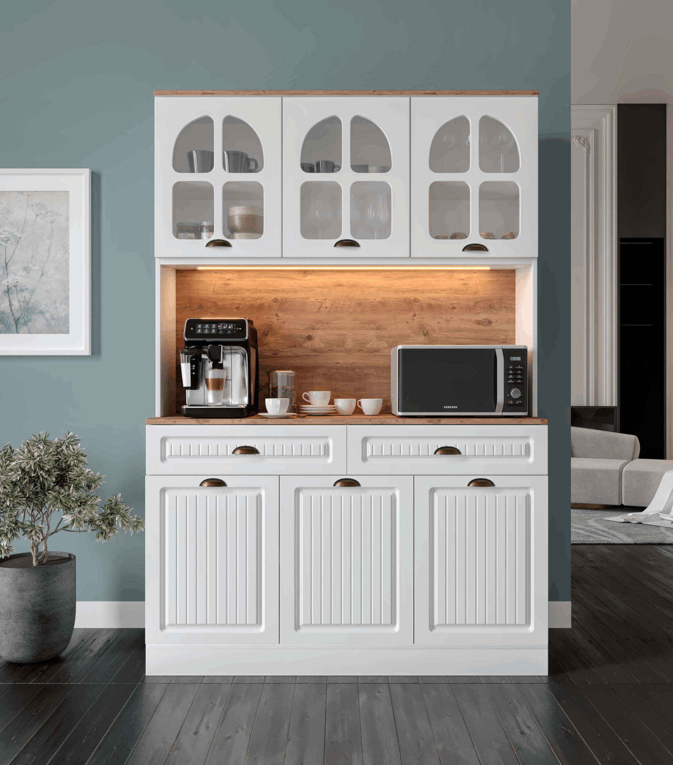 Seronay Vesta Kahve Köşesi - 140 cm MDF Mutfak Dolabı - LED Aydınlatmalı -, kahve hazırlık alanını düzenli ve şık hale getirmek isteyenler için tasarlanmış modern bir kahve köşesi çözümüdür. Günlük kullanıma uyum sağlayan depolama alanı ve sergileme yüzeyi sayesinde mutfak ya da yaşam alanına düzenli bir görünüm kazandırır.
